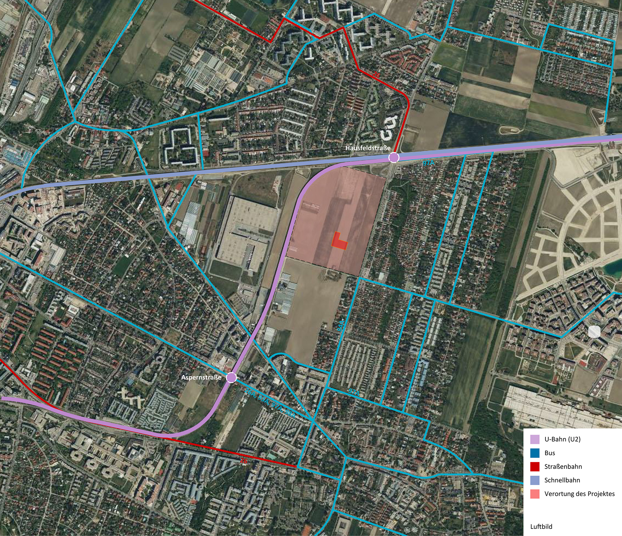 - Das Wohnprojekt befindet sich in unmittelbarer Nähe zur U2 Station Hausfeldstraße. Die U2 Station „Oberes Hausfeld“ am Lina-Loos-Platz befindet sich derzeit noch in