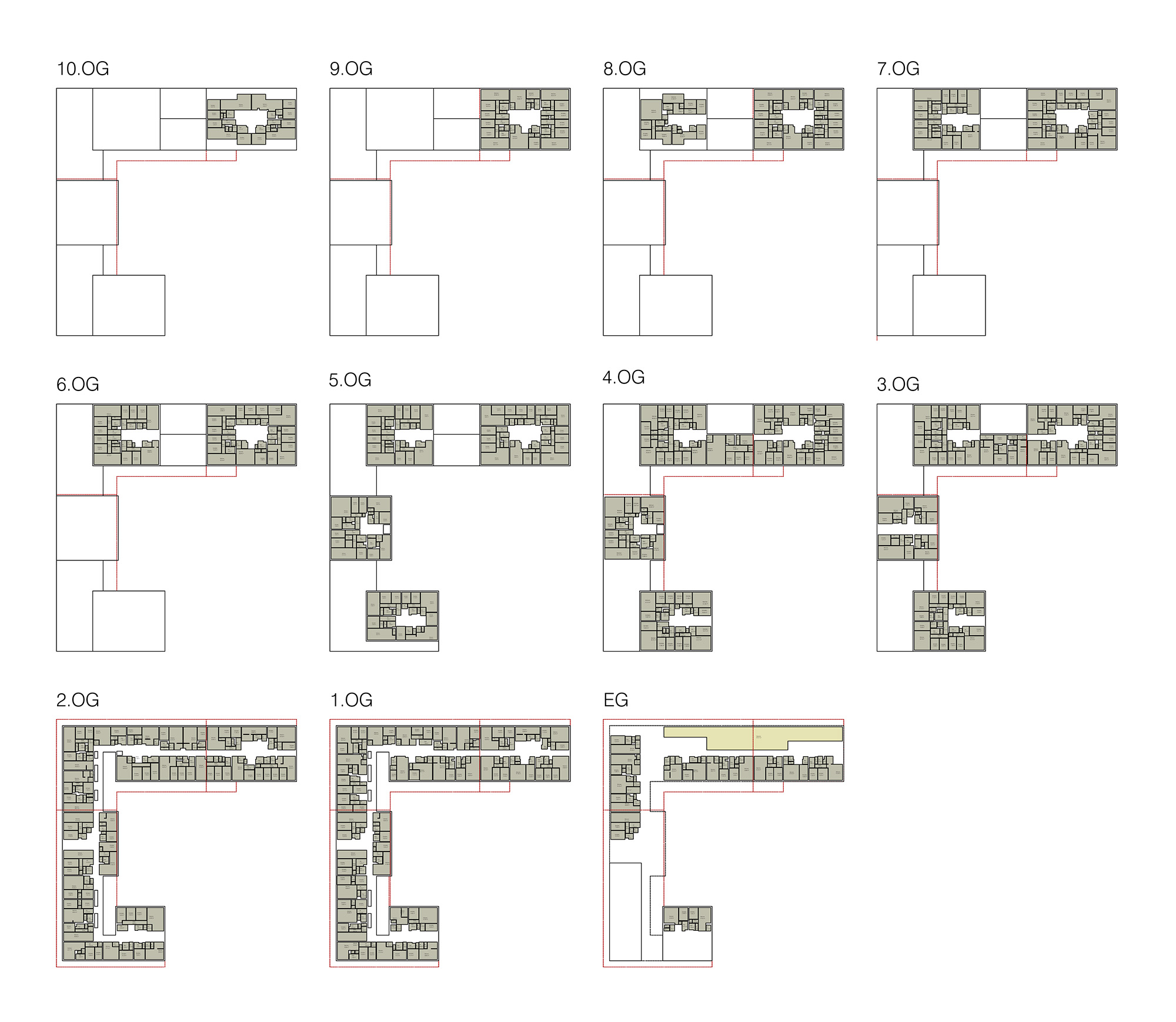 - das Projekt stellt den im Quartier „Oberes Hausfeld“ gelegenen mittleren Teil eines bauplatzübergreifenden Gemeinschaftsprojekts dar. Dieses besteht aus einer 3-geschossigen Sockelzone mit umlaufenden Arkadengang und darauf aufgesetzt, freistehende und zueinander versetzte Punktbaukörper in unterschiedlicher Höhe - „die Punkte am Hausfeld“
