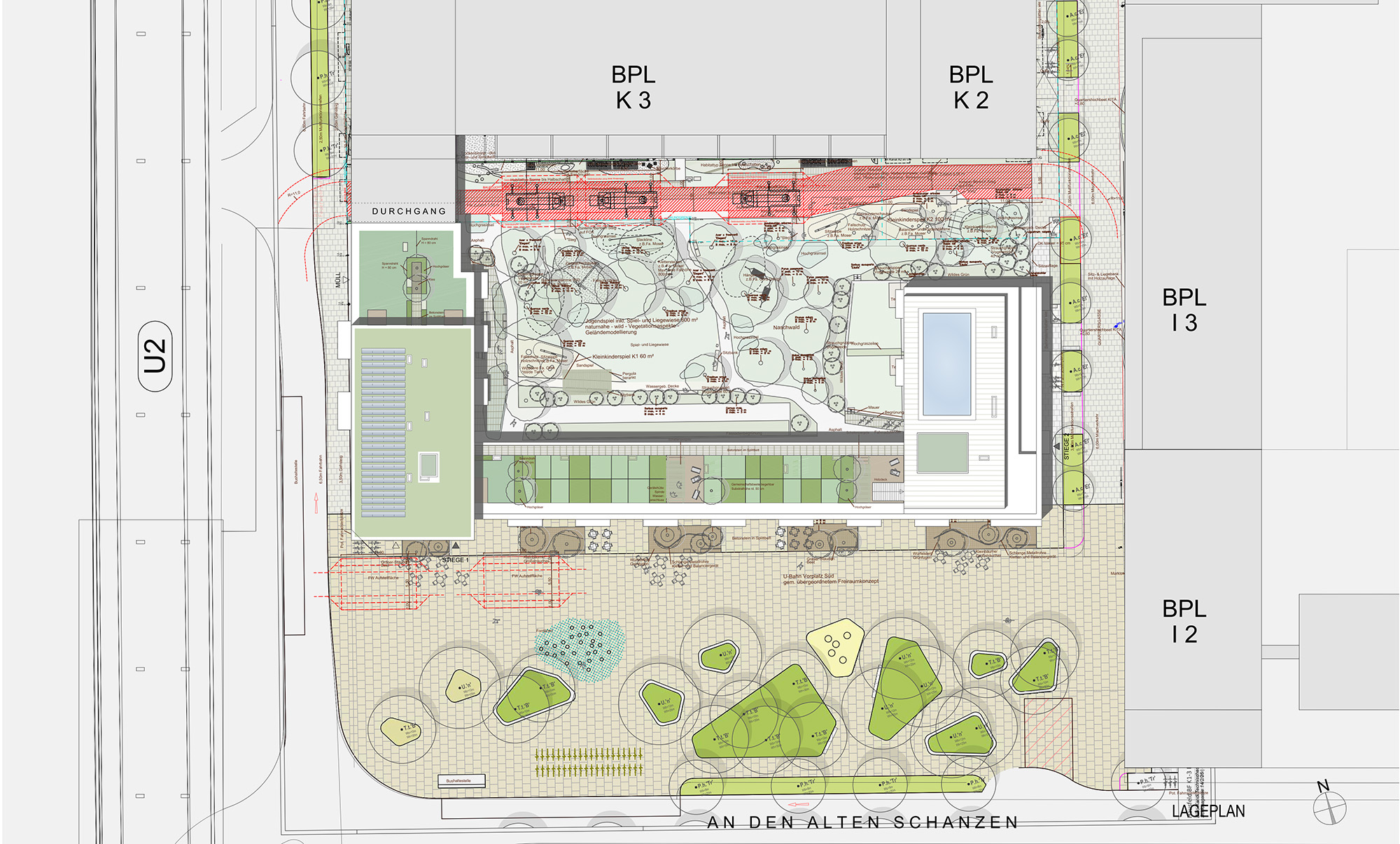 - das Projekt stellt den „An den alten Schanzen“ gelegenen Eckbereich eines bauplatzübergreifenden Gemeinschaftsprojekts in unmittelbarer Nähe zum zukünftigen U-Bahnvorplatz dar. Dieses besteht aus einem unterschiedlich hohen U-förmigen Bauteil mit einem gemeinschaftlich genutzten Dachgarten und Schwimmbad am Dach