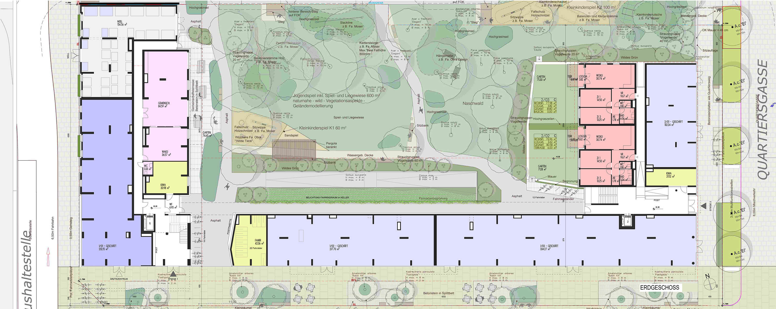- bauplatzübergreifender in Hügeln und Hochgrasinseln eingebetteter hofseitiger Kinder- und Jugendspielplatz mit Spielwiese (ausgestattet mit Balancierstämme, Kletterstelzen, Hängematten, etc.)