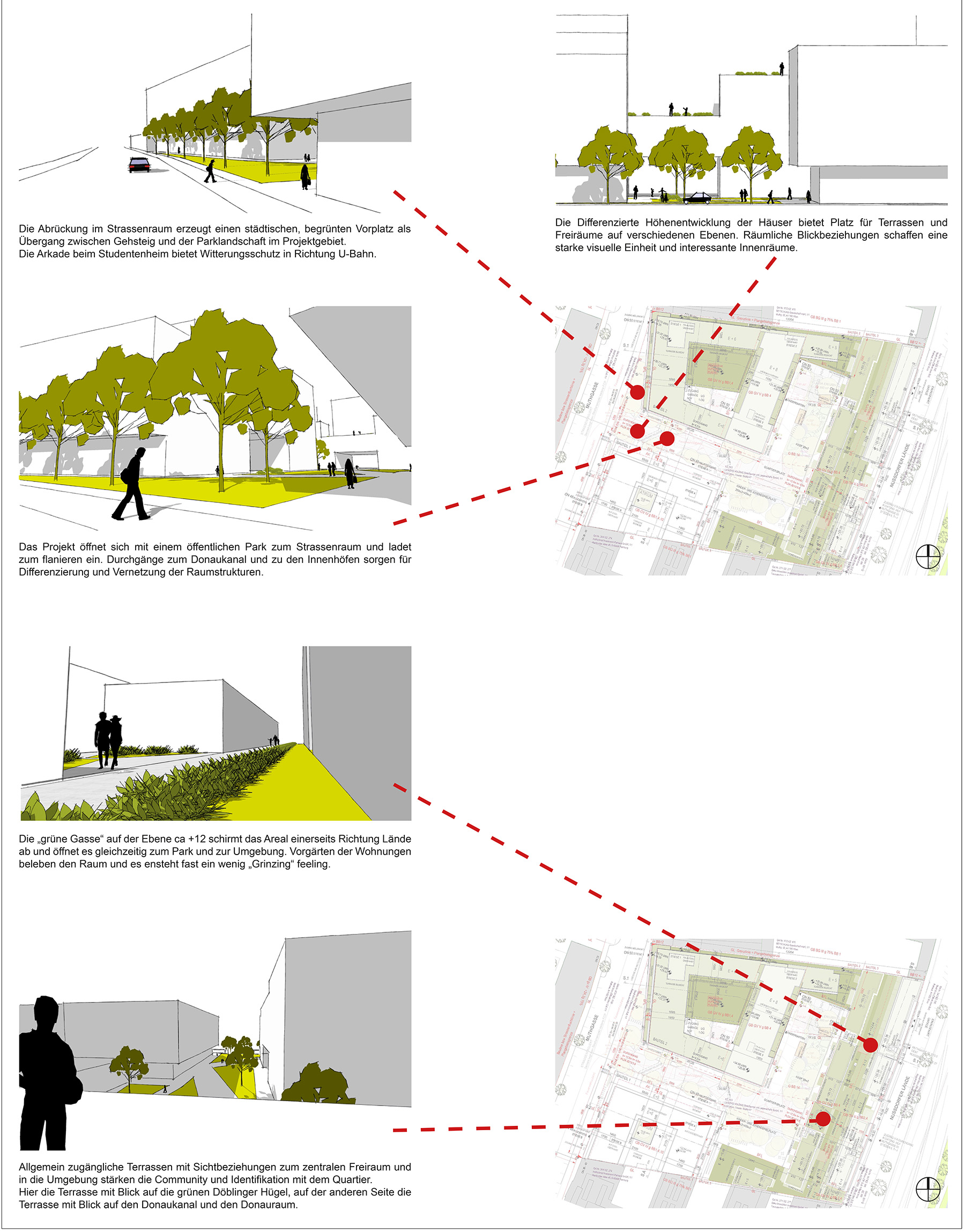 - „Grüne Gasse“ mit Grinzing-Feeling beim Bauteil 3 mit zwei Gemeinschaftsterrassen – der Hofterrasse und der Donauterrasse hin zum Donaukanal als informelle Treffpunkte mit Nachbar*innen