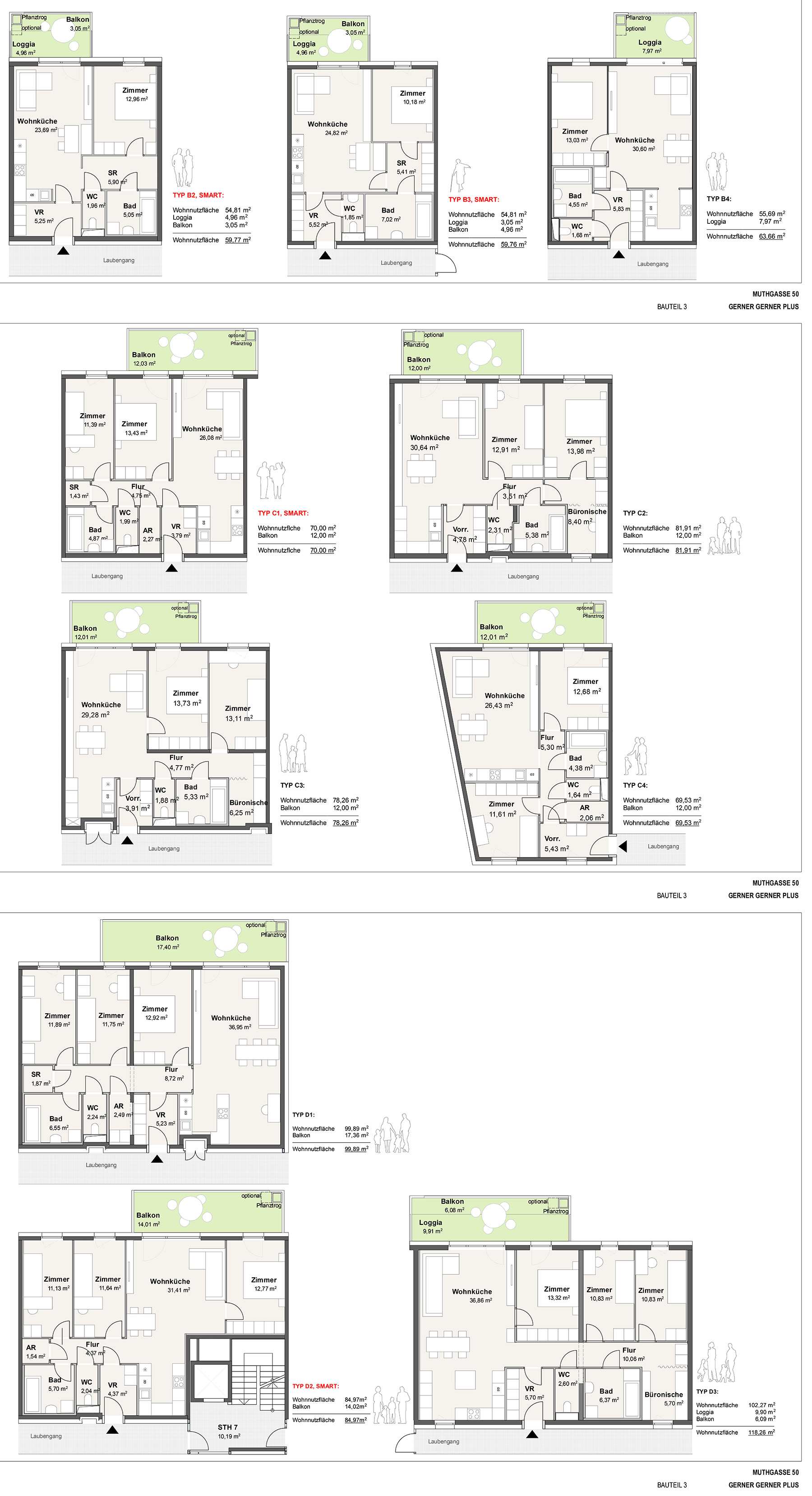 - Der gesamte Bauplatz besteht aus drei Bauteilen. Im Bauteil 1 befindet sich ein Student*innenheim und freifinanzierte Gewerbeflächen (nähere Informationen hierzu sind nur über den Bauträger möglich). Die Bauteile 2 und 3 bestehen größtenteils aus geförderten Wohnungen. Insgesamt werden 238 geförderte Mietwohnungen errichtet, davon werden 119 Wohnungen nach dem SMART-Wohnbauprogramm mit Superförderung umgesetzt.