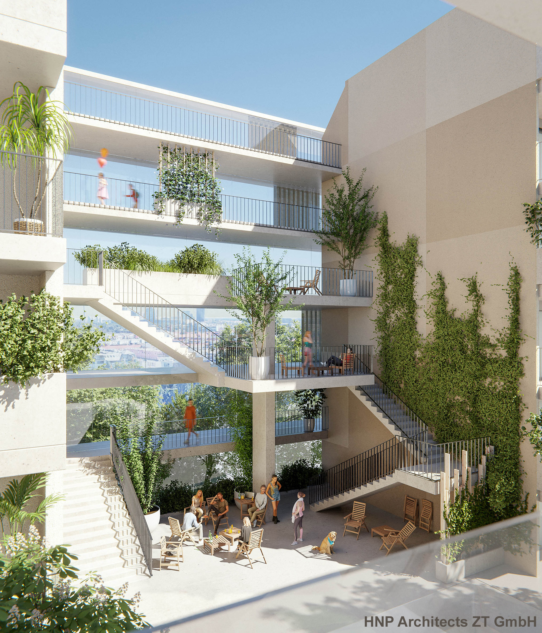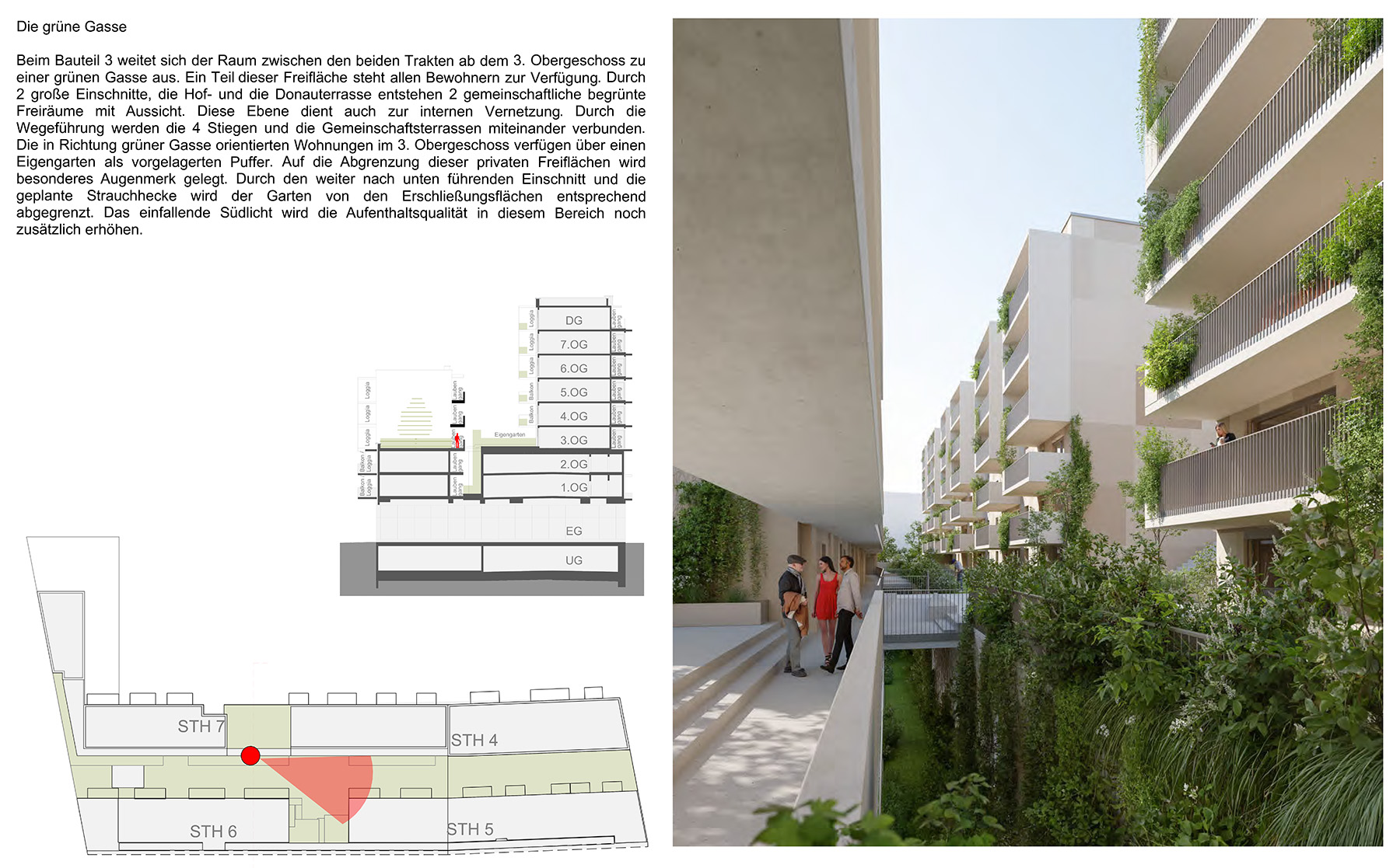 - „Grüne Gasse“ mit Grinzing-Feeling beim Bauteil 3 mit zwei Gemeinschaftsterrassen – der Hofterrasse und der Donauterrasse hin zum Donaukanal als informelle Treffpunkte mit Nachbar*innen