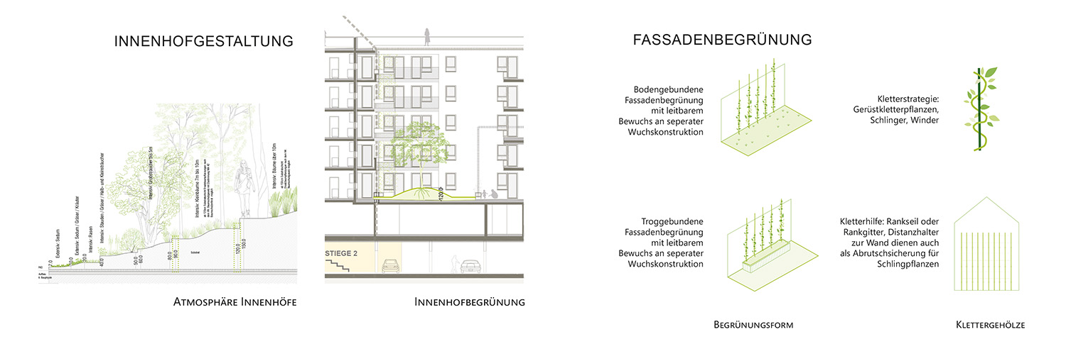 - mehrere unterschiedlich ausgestattete Gemeinschafts-Dachterrassen im 3. und 6. Obergeschoß mit Dachbegrünung, schattenspendenden Sonnensegel, Outdoorküche, Urban-Gardening und begrünten Aufenthaltsmöglichkeiten ausgestattet
