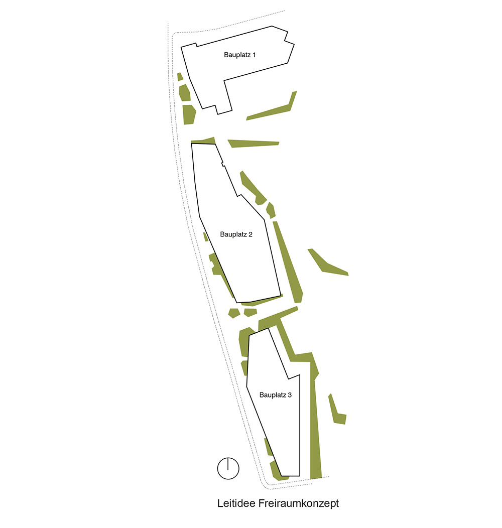 - Bauplatzübergreifender Jugendspielplatz am Quartiersplatz mit grünen Sitzinseln und Wasserspielen
