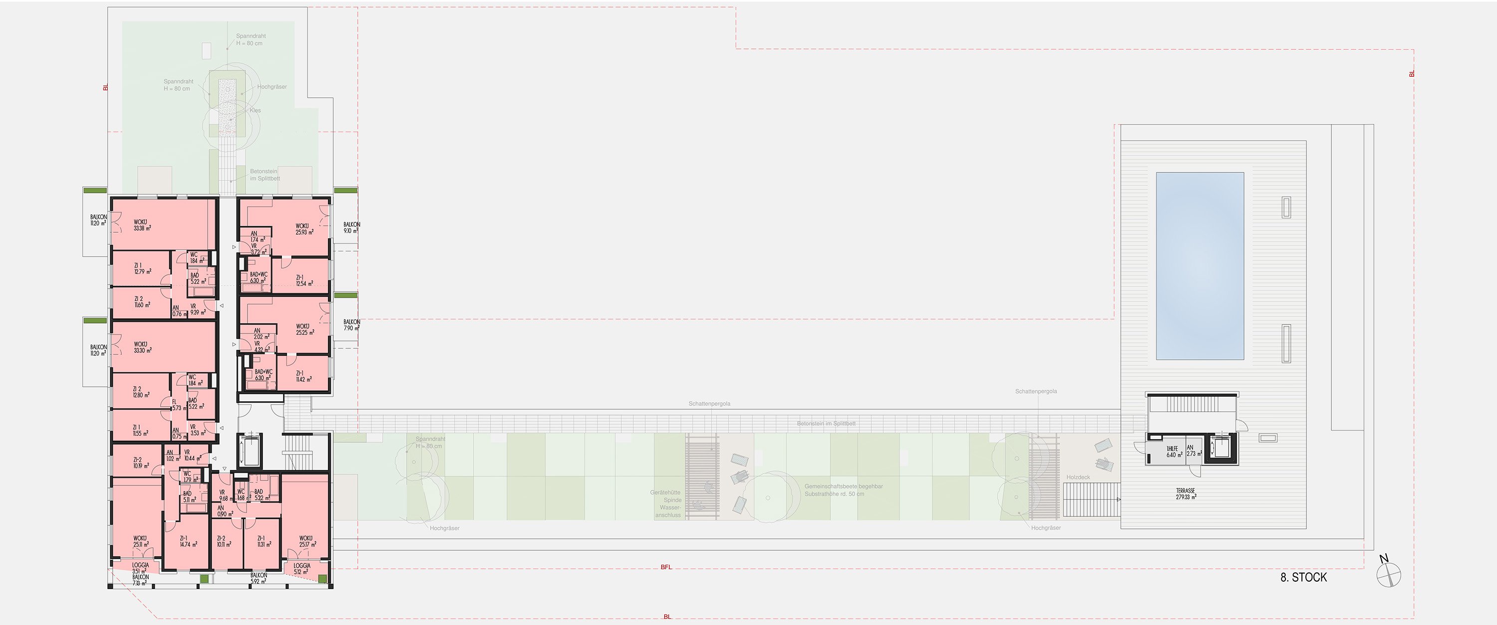 - Dach-Pool mit Sonnenterrasse im 8. Obergeschoß wird zusätzlich mittels Außentreppe vom Dachgarten im 7. OG aus erreichbar sein