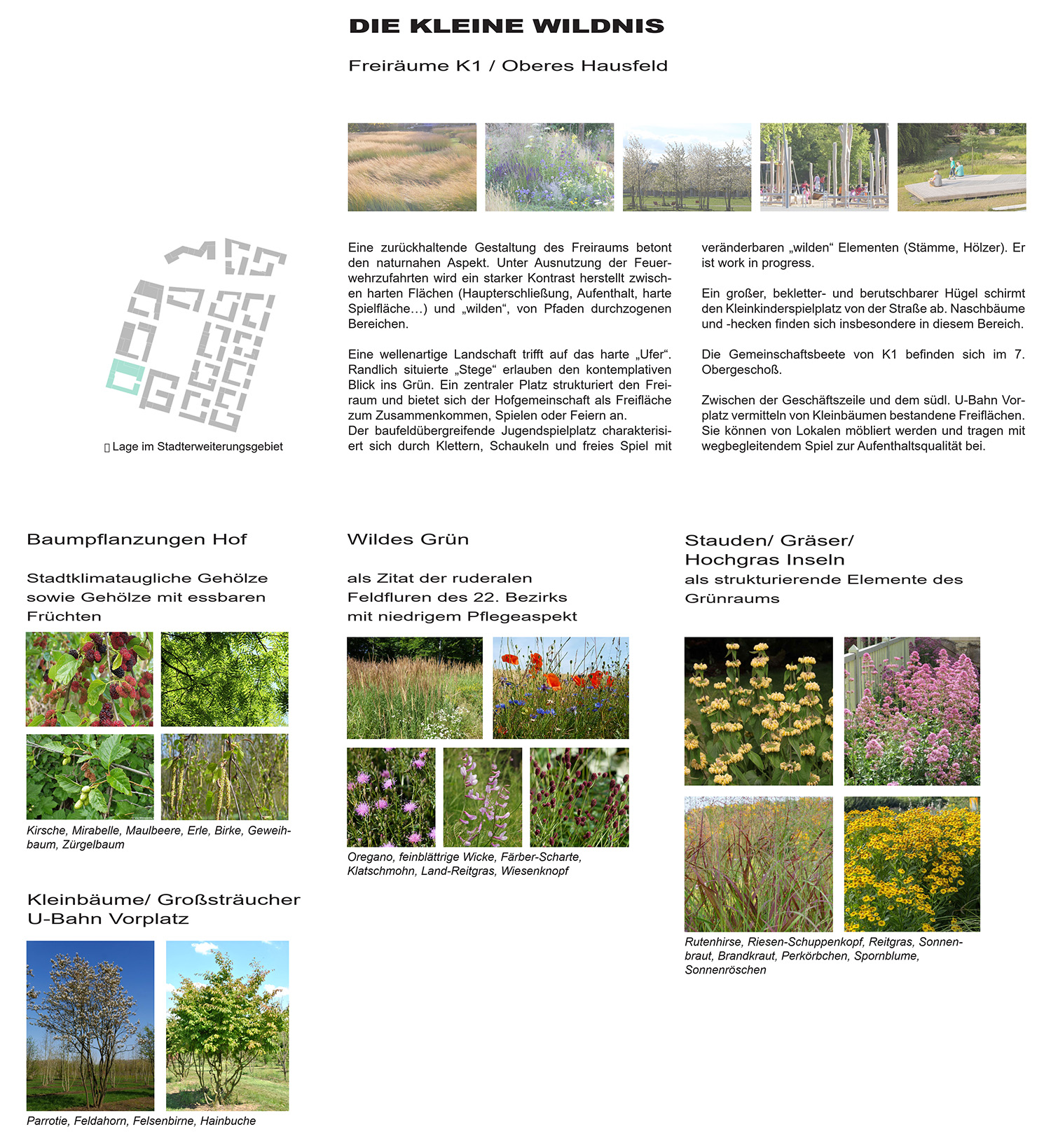 - bauplatzübergreifender in Hügeln und Hochgrasinseln eingebetteter hofseitiger Kinder- und Jugendspielplatz mit Spielwiese (ausgestattet mit Balancierstämme, Kletterstelzen, Hängematten, etc.)