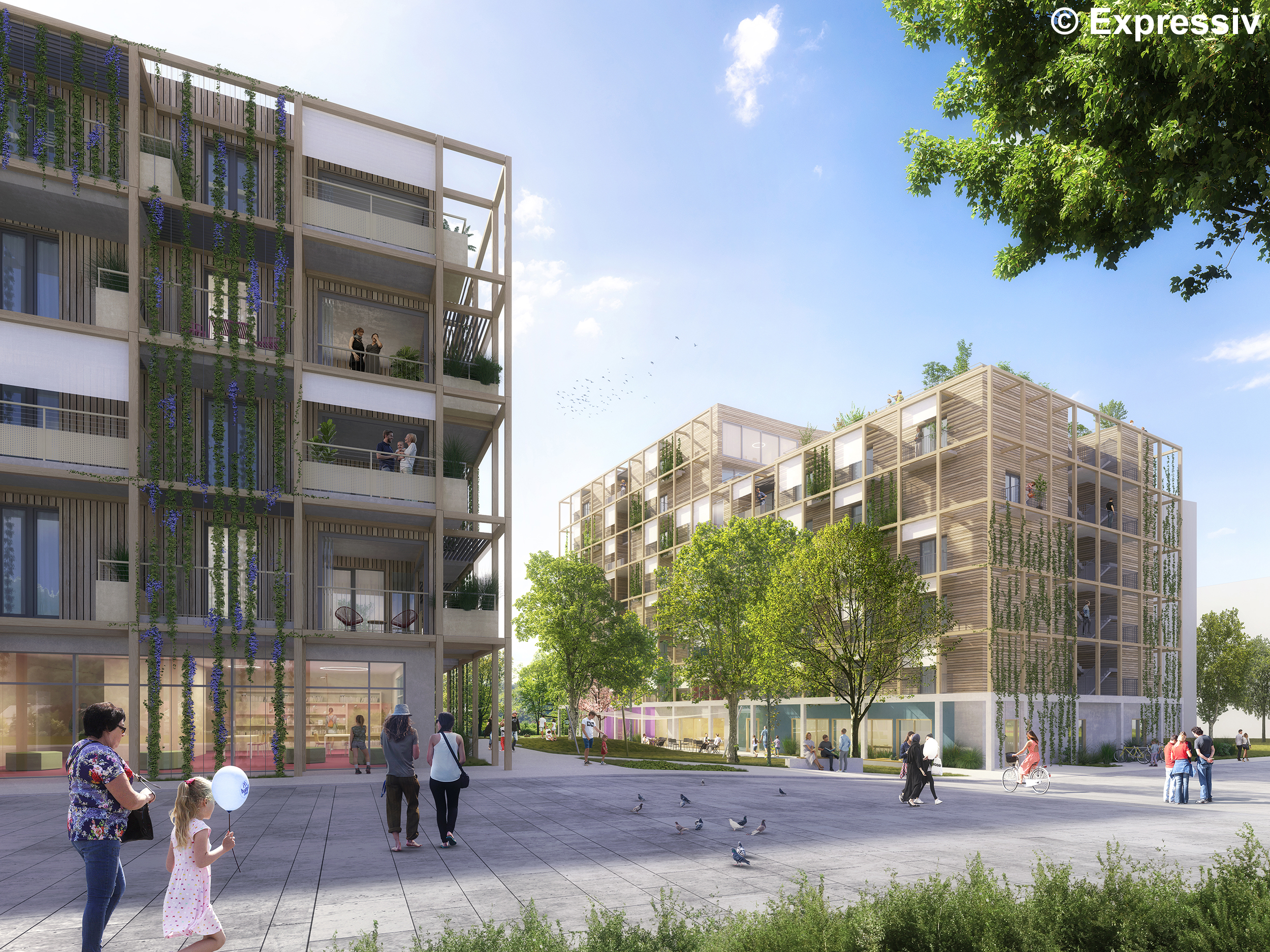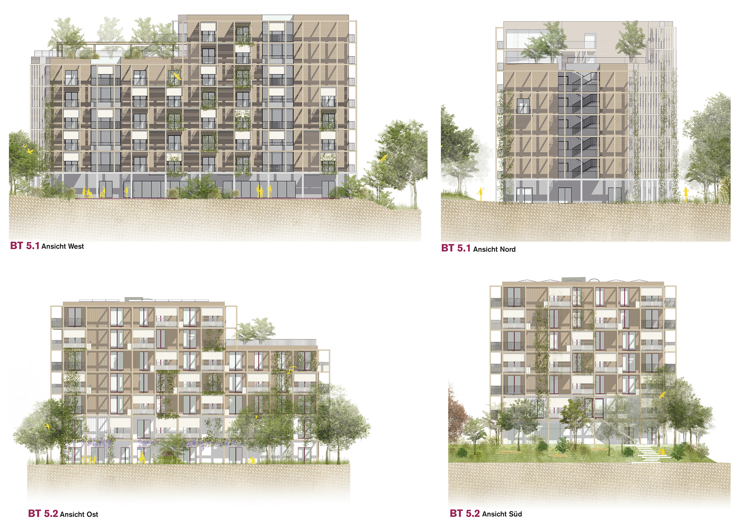 - Das Projekt besteht aus zwei kompakten sieben- und achtgeschossigen Baukörpern mit einer vorgelagerten Regalkonstruktion, welche die Balkone umfasst und für mehr Sonnenschutz aufgrund der Begrünung sorgt.