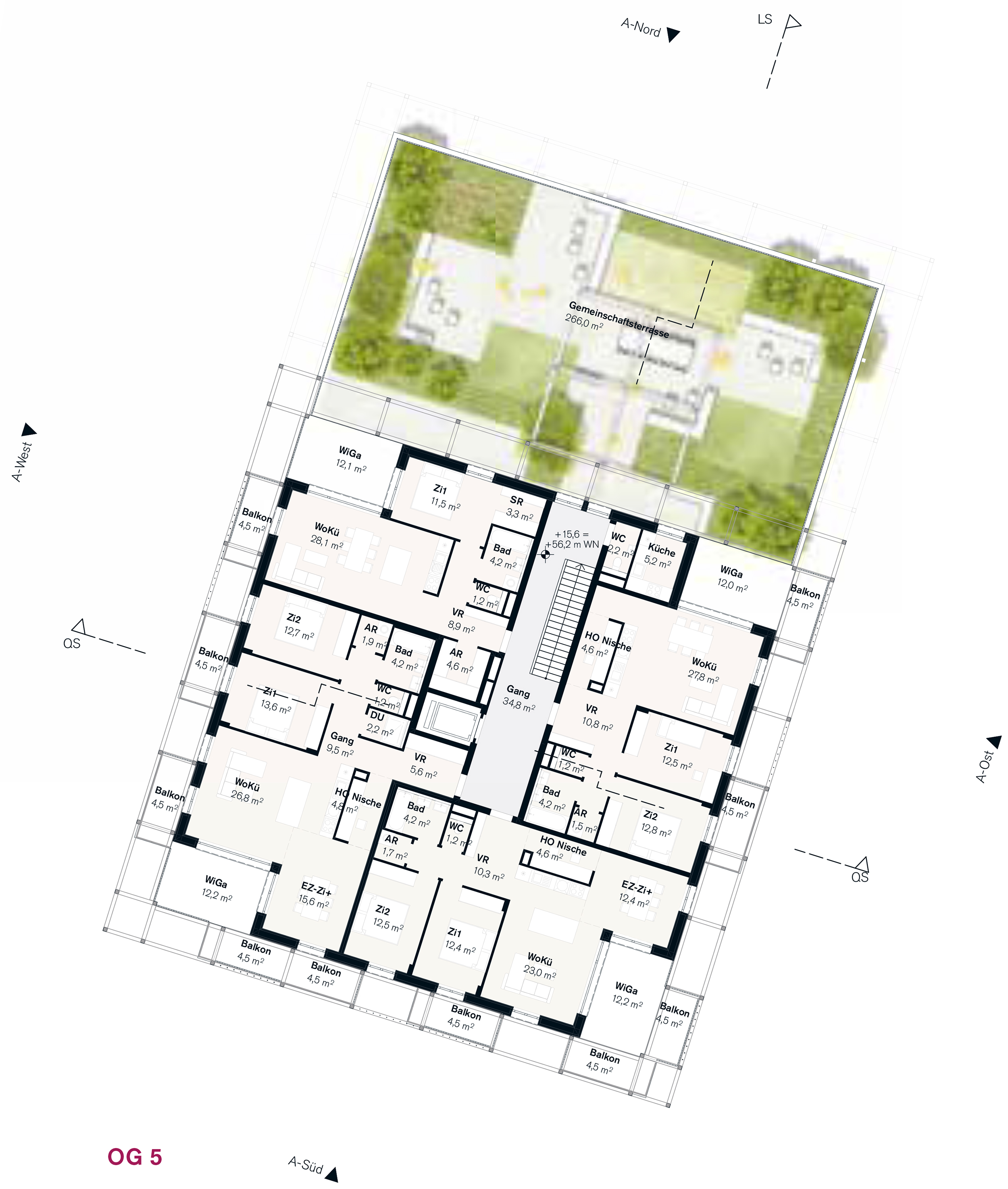 - Gemeinschaftsterrasse mit Hochbeeten im 5. Obergeschoß des Familienwohnhauses sowie mit Gemeinschaftsküche im 6. Obergeschoß des WOAL-Hauses