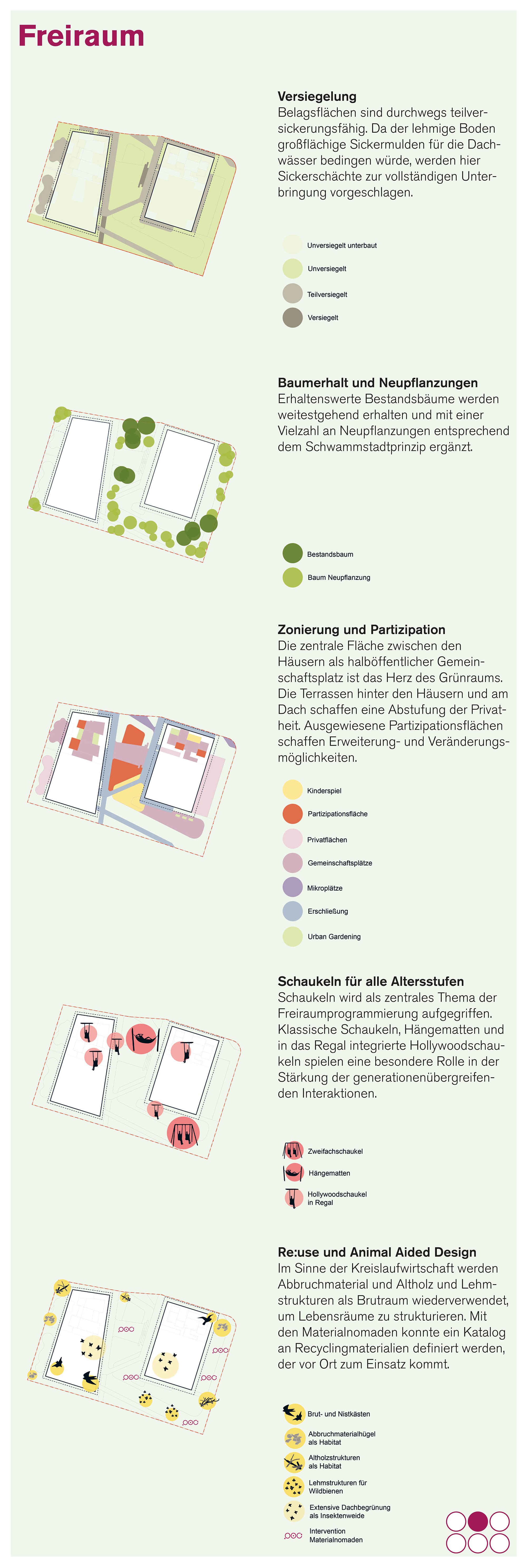 - die zentrale Rasenfläche ist das Herz des Grünraums mit seinem Kinderspielplatz, einer großen Tafel für das gemeinsame Mittagessen und Spielgeräte, die für alle Altersgruppen geeignet sind