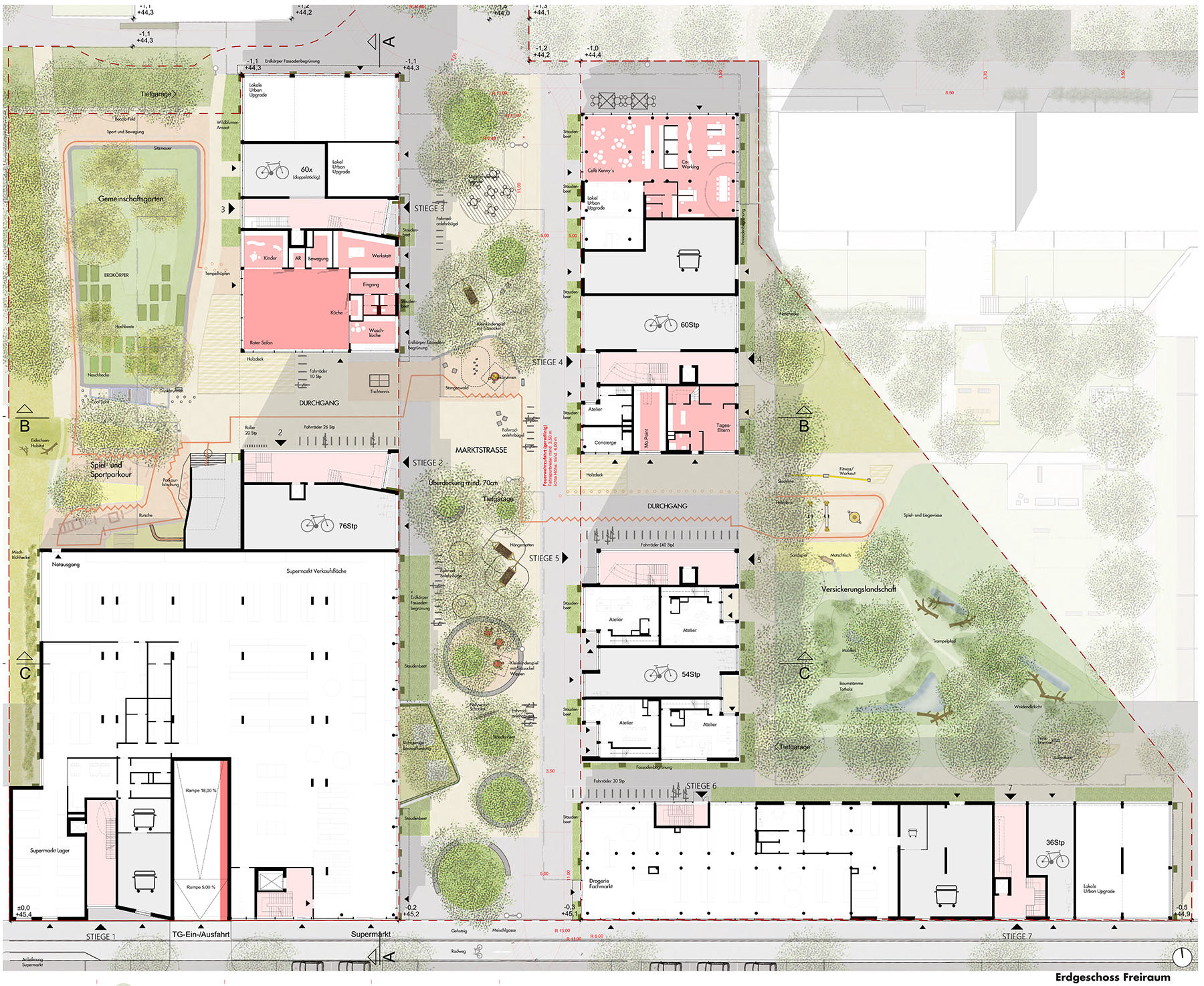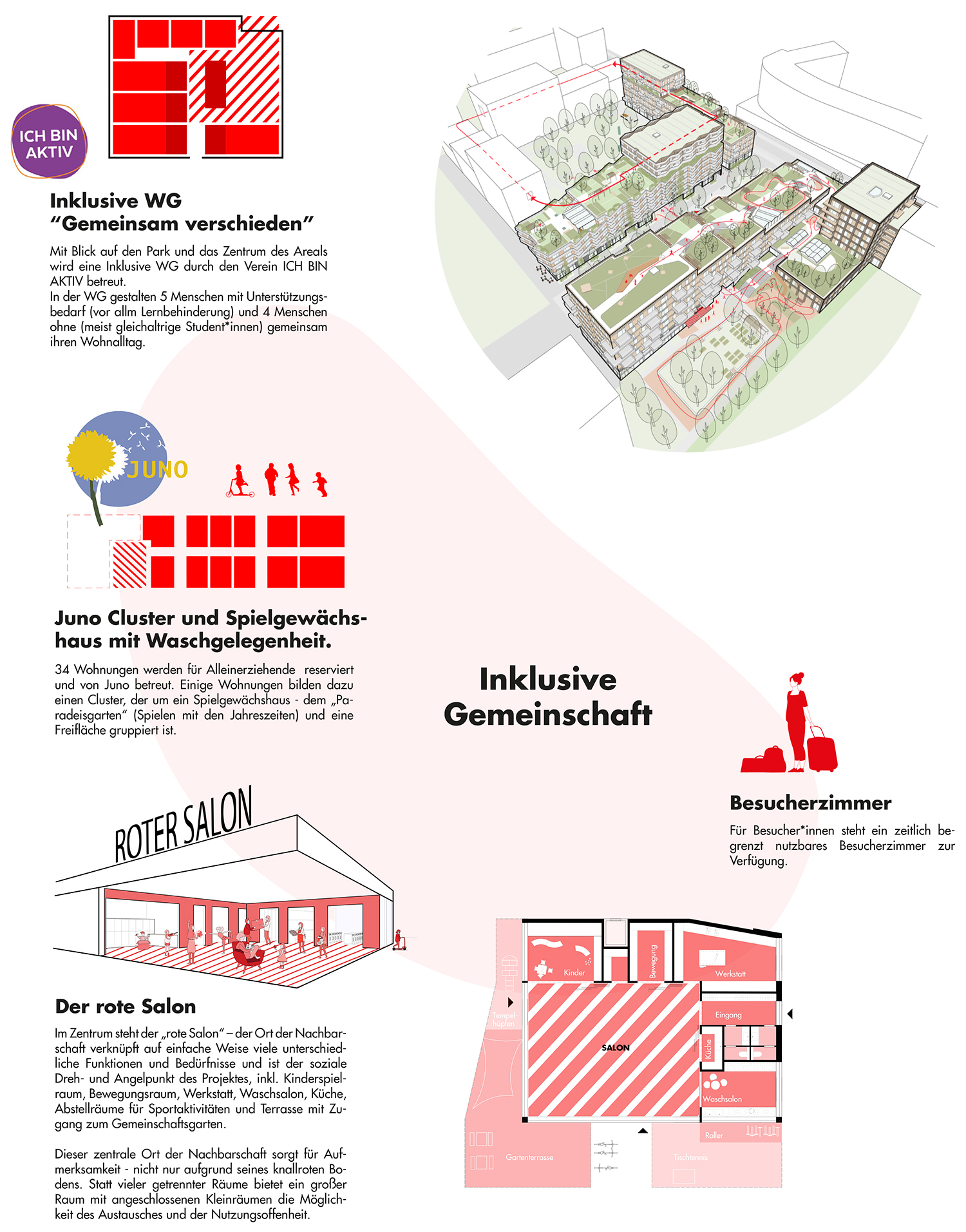 - „Roter Salon“ als gesellschaftliches Zentrum der Anlage mit angebundenem Kinderspiel- und Bewegungsraum, Werkstatt und Waschküche