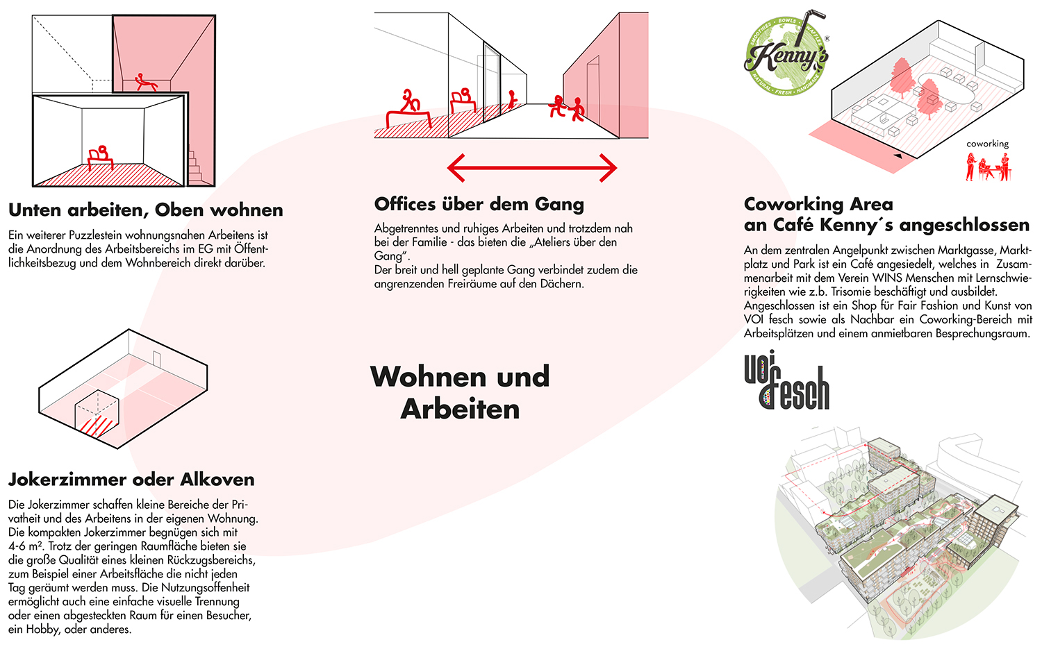 - Erdgeschosszone mit gemeinschaftlichen und gewerblichen Nutzungen, z.B. Café Kenny’s als Generationentreffpunkt, Co-Workingzone für Homeoffice, Concierge-Stützpunkt und Tageselternwohnbereich