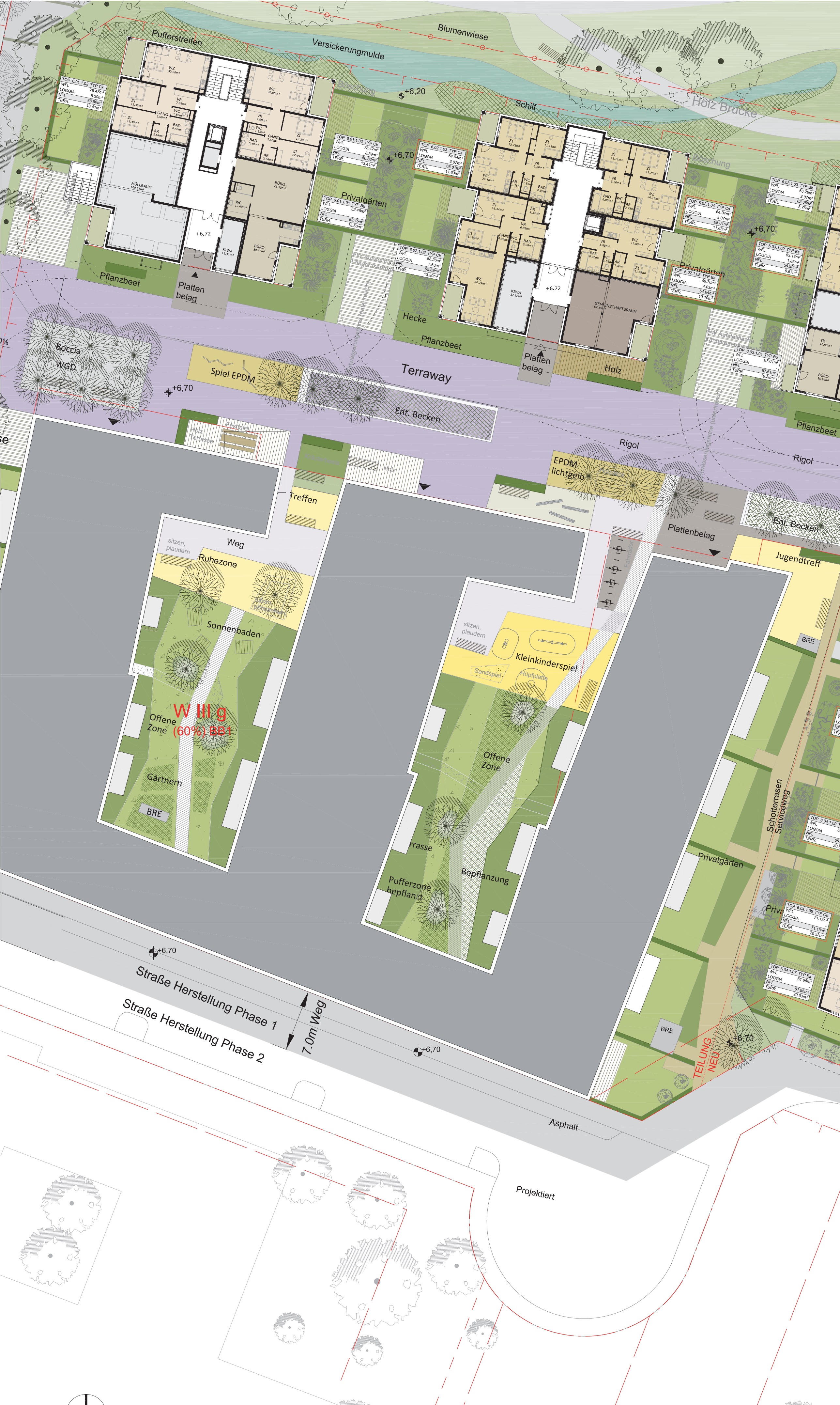 - erschlossen werden die Wohnungen über das zentrale Wohnband (gemeinsam mit Bauplatz 4) und über Stiegenhäuser in den jeweiligen Gebäuden