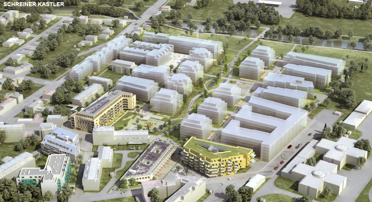 - die Wohnhausanlage auf Bauplatz 6 besteht aus neun Gebäuden mit insgesamt 350 geförderten Mietwohnungen, davon 84 SMART-Wohnungen sowie 83 SMART-Wohnungen mit Superförderung