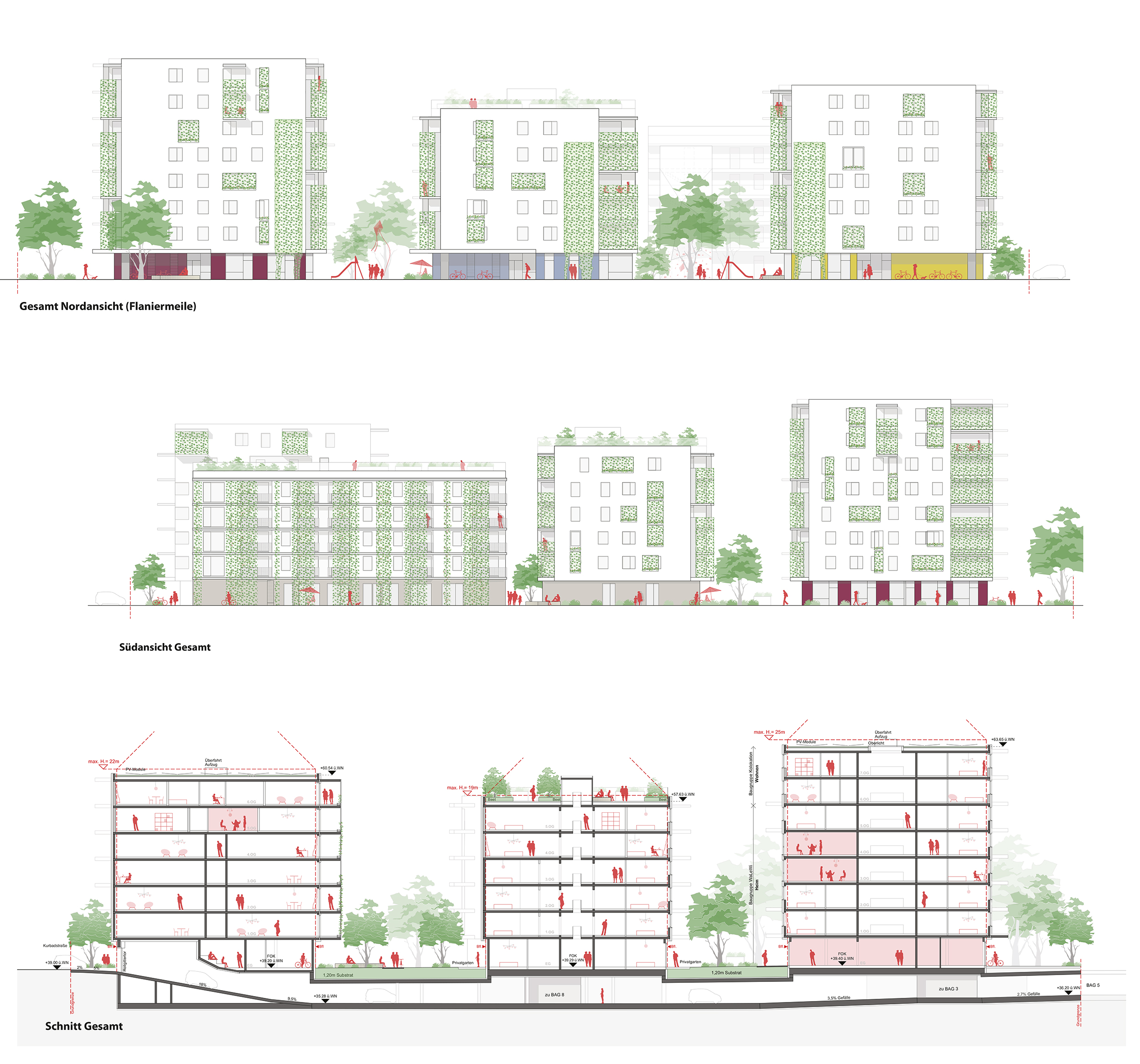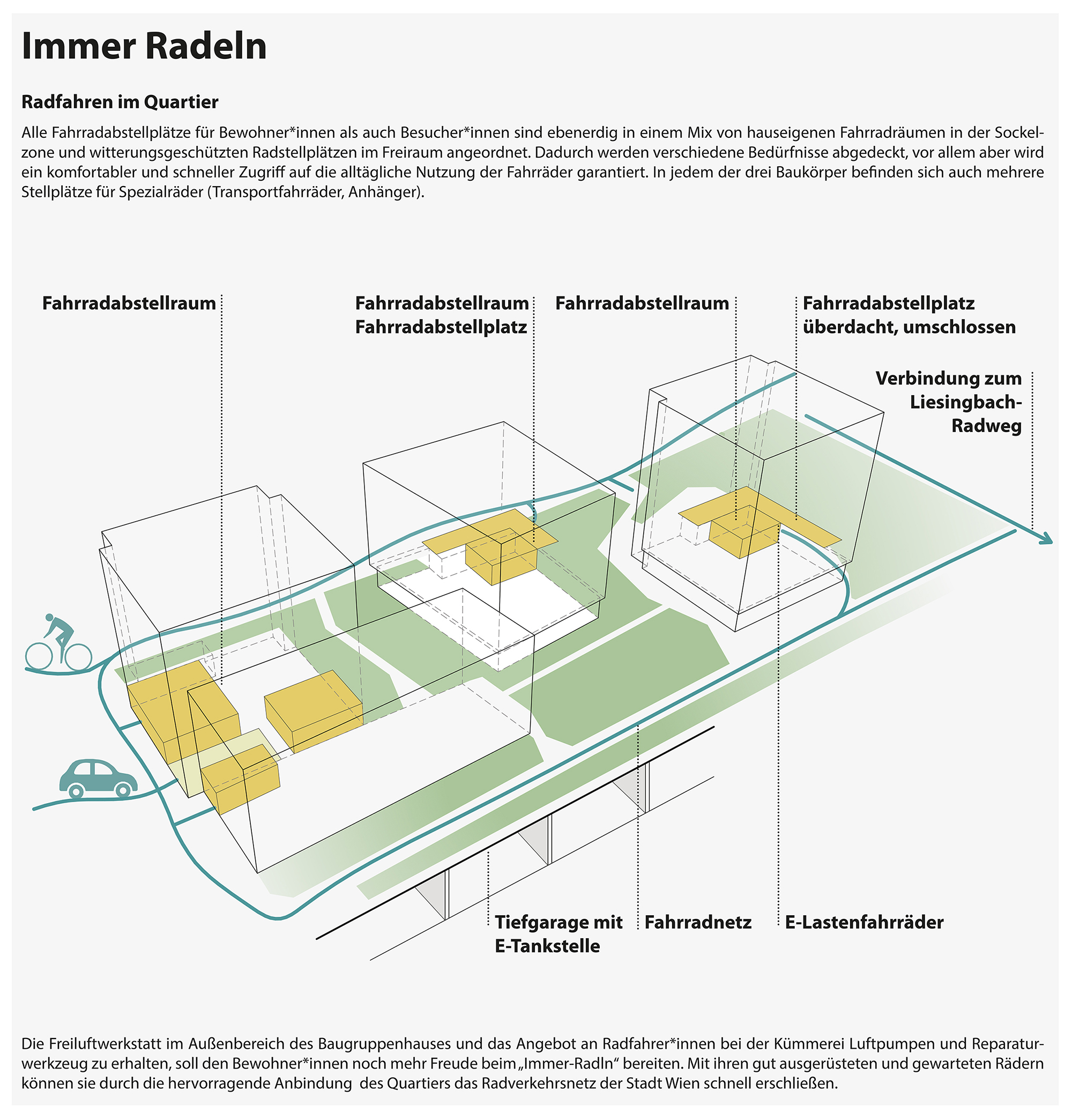 - leicht zugängliche Fahrrad- und Kinderwagenabstellräume in der EG-Zone der jeweiligen Baukörper