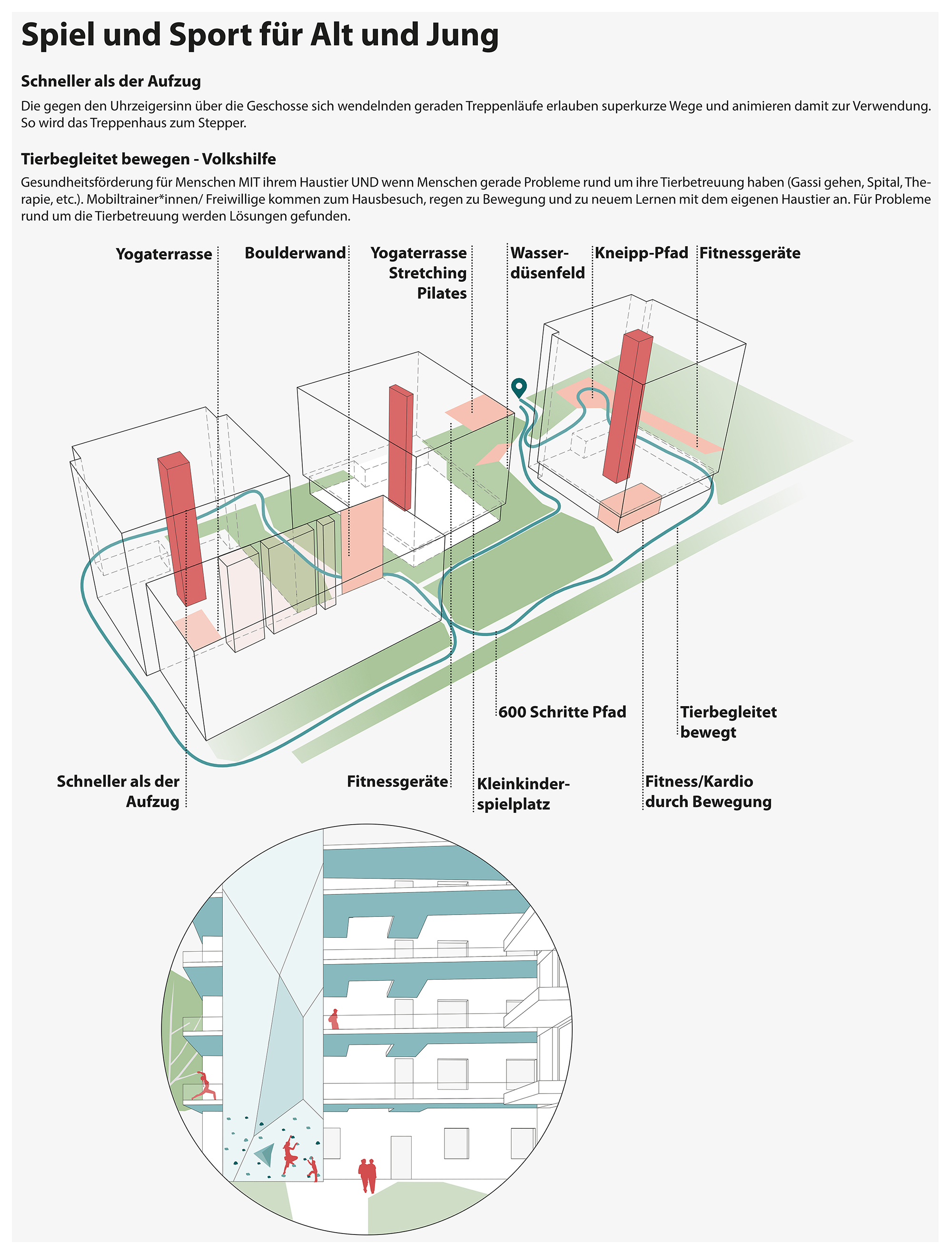 - im Baugruppenhaus befindliche WaLeWi-aktive Sockelzone mit Impulsraum samt Gemeinschaftsküche für kleine Veranstaltungen, einem Fitnessraum, Bewohner*innen-Werkstatt und Food-Coop