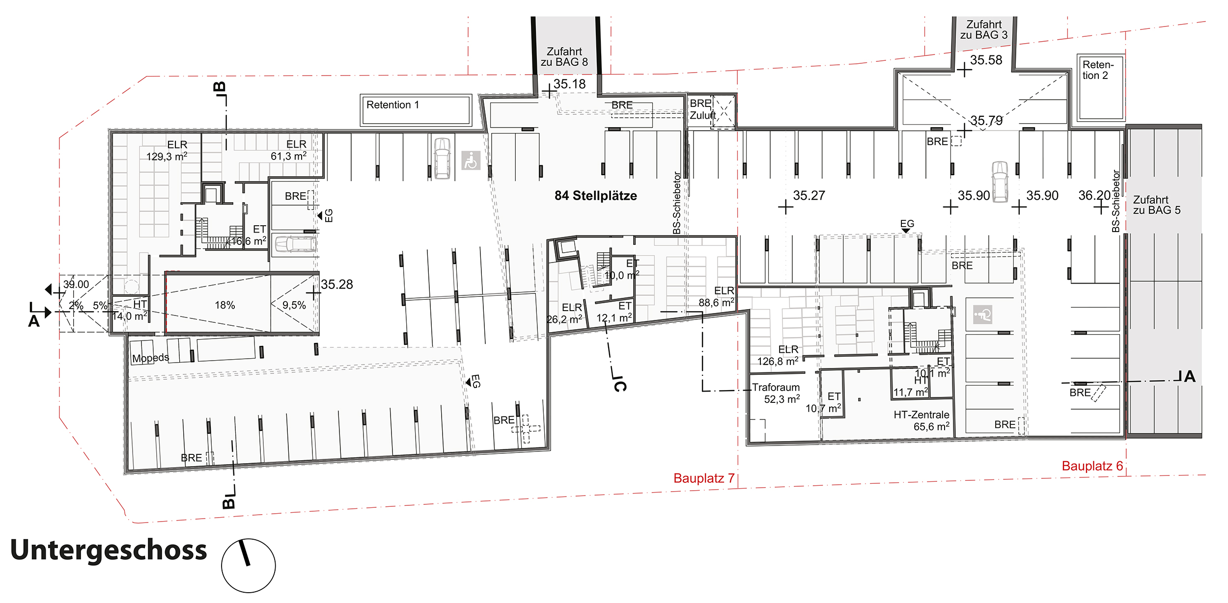 - ca. 80 PKW-Garagenstellplätze (projekteigene Tiefgarage dient als Sammelgarage für Bauplatz 3, 4 und 6)