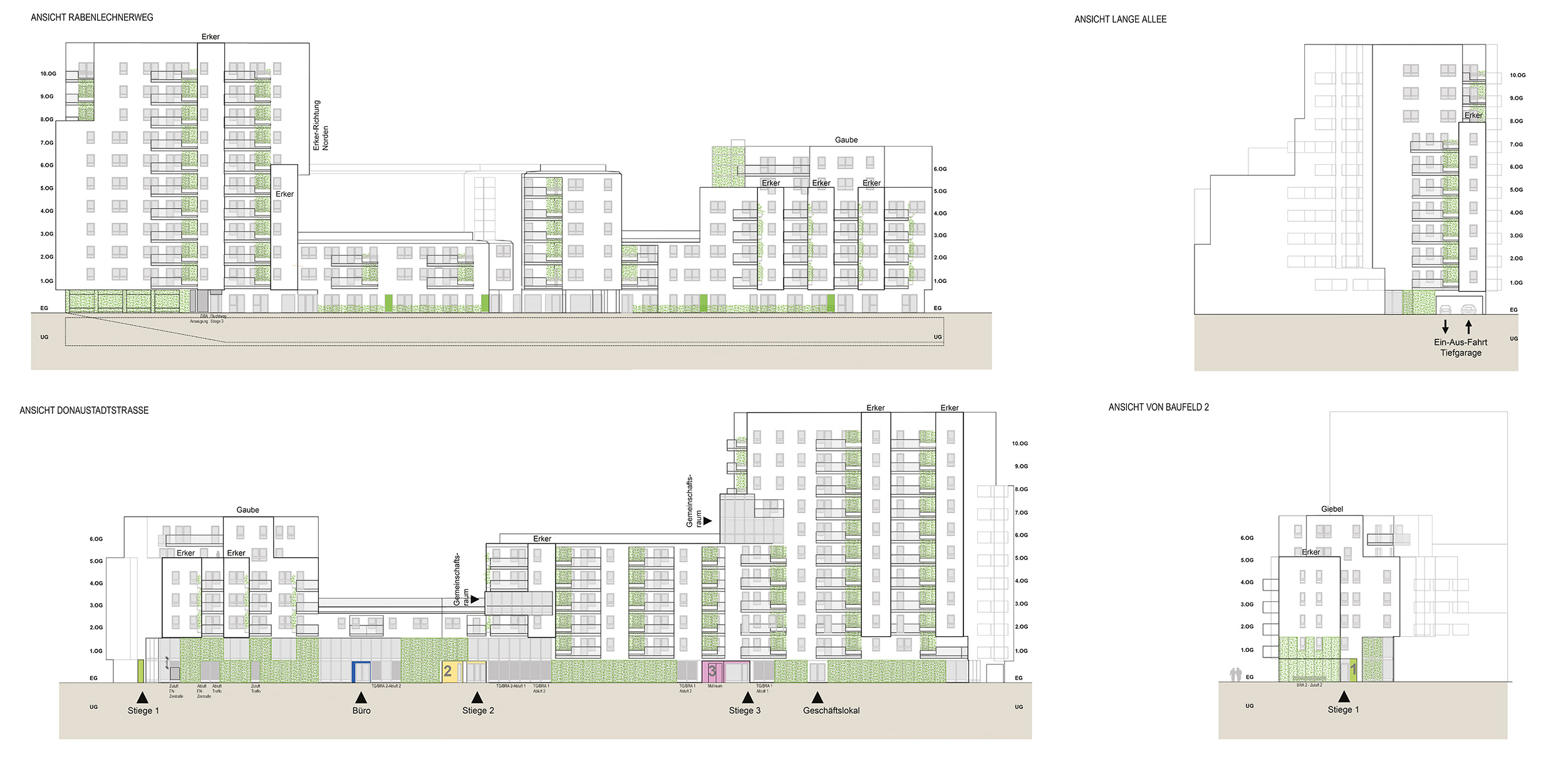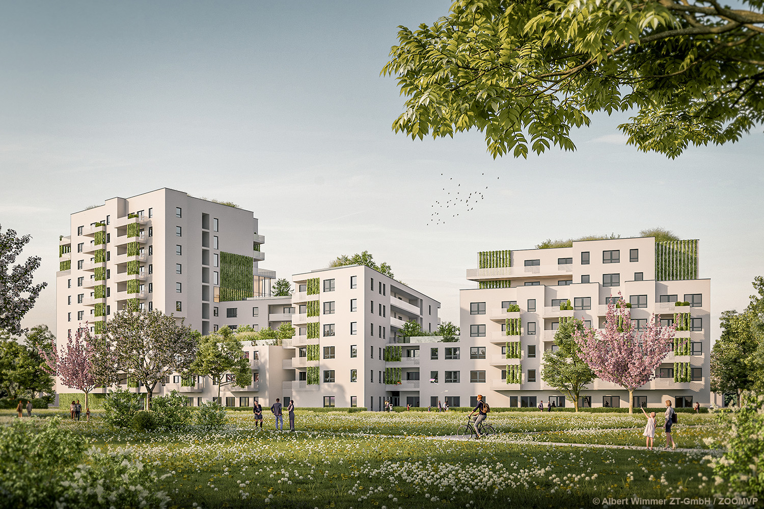 - das Neubauprojekt vom Bauträger „Gesiba“ umfasst 134 Wohnungen, wovon 69 Wohnungen nach dem SMART-Wohnbauprogramm umgesetzt werden. Das Gebäude besteht aus einem zusammenhängenden Baukörper mit unterschiedlichen Höhen, wobei sich auf mehreren Zwischenebenen Gemeinschaftsterrassen mit Urban-Gardening befinden.