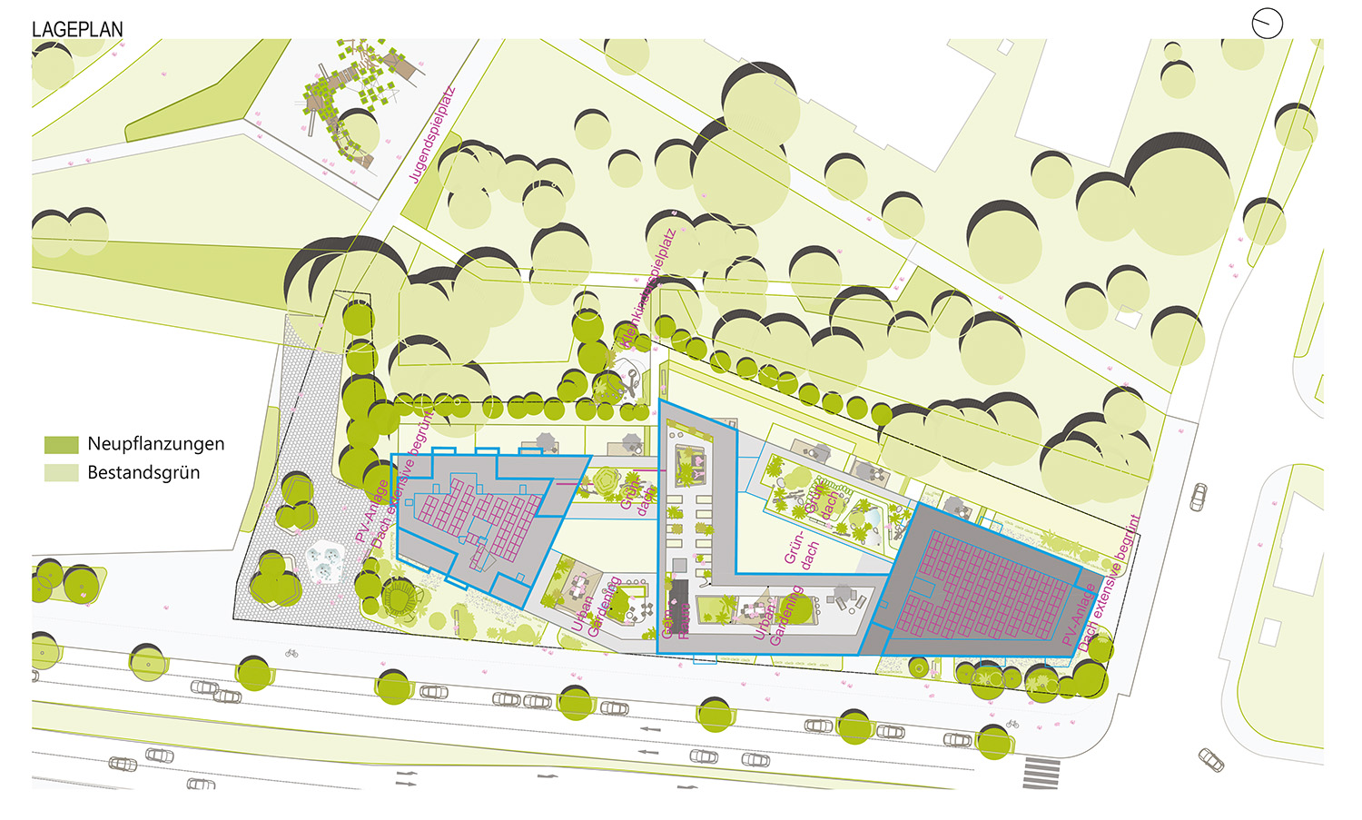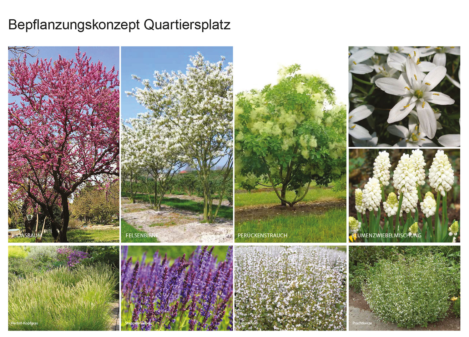 - Bauplatzübergreifender Jugendspielplatz am Quartiersplatz mit grünen Sitzinseln und Wasserspielen