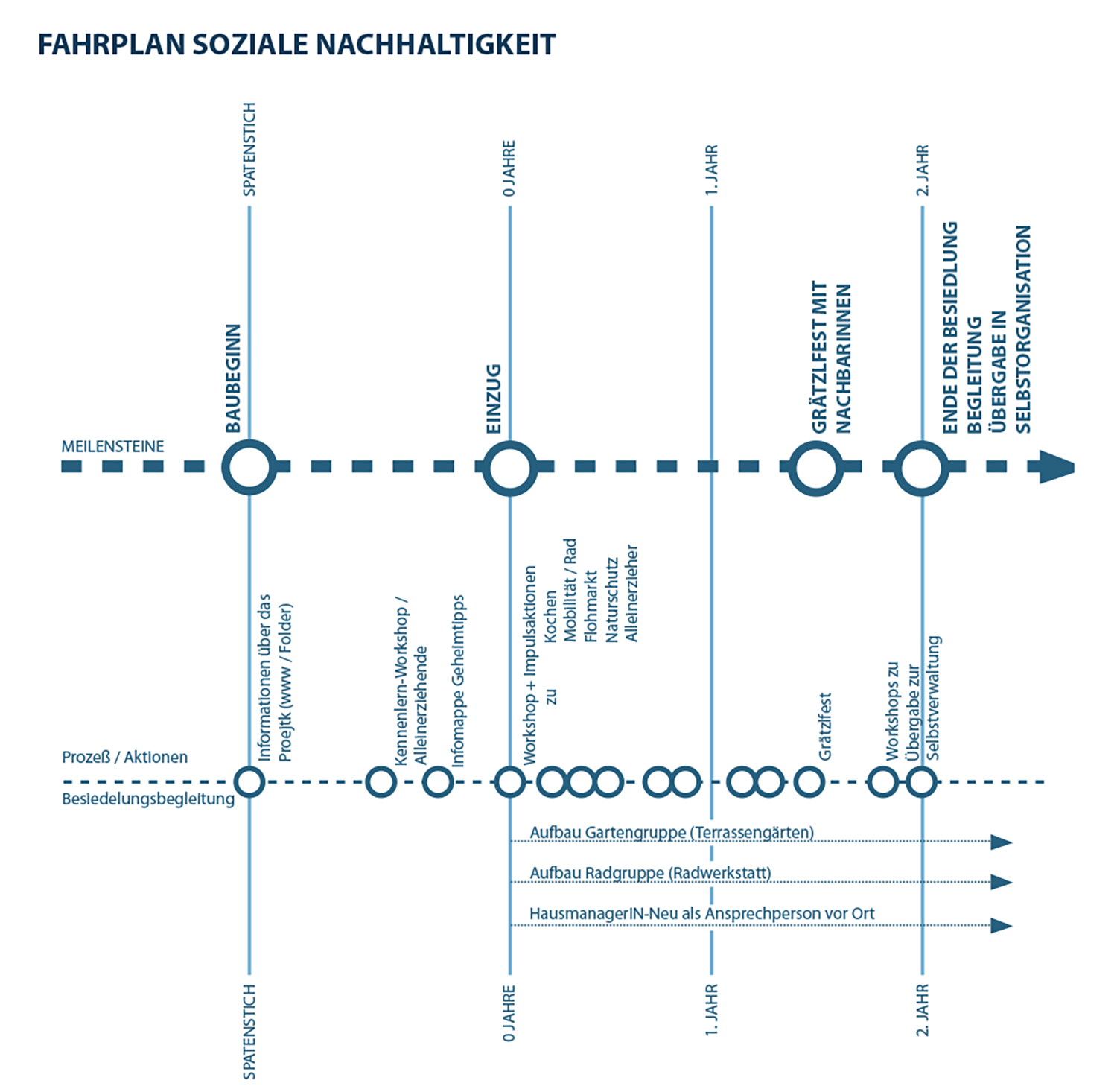 - organisierte Workshops zur Nutzung und Ausstattung der Gemeinschaftsräume sowie gemeinsame Kochkurse in der GrätzlKANTINE geplant