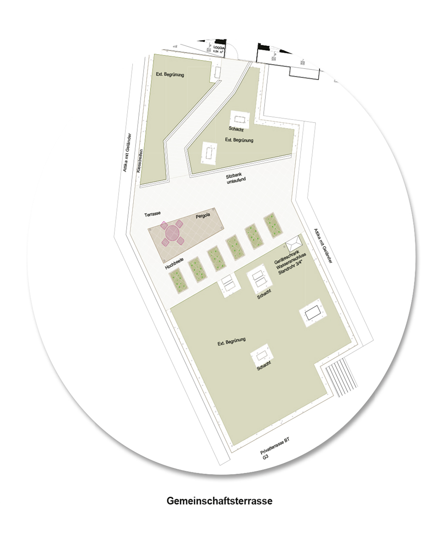 - eine Dachterrasse bietet die Möglichkeit für ein spontanes Zusammentreffen der Nachbarschaft – Hochbeete für Urban Gardening, ein Arbeitstisch, ein Getränkeschrank sowie eine Pergola runden das Angebot ab