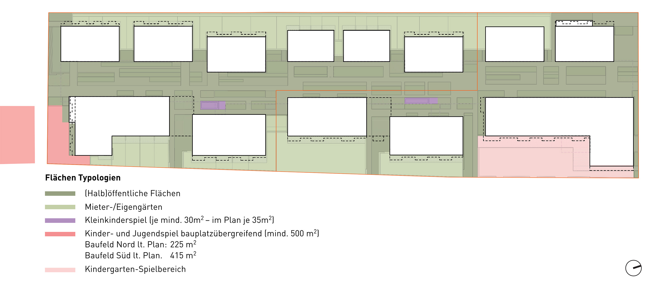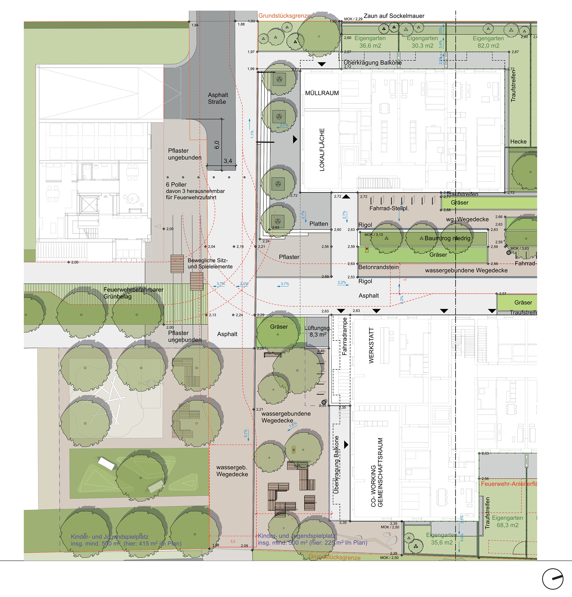 - bauplatzübergreifender an der Straße „am Rain“ situierter Kinder- und Jugendspielplatz, ausgestattet mit Balancier- und Kletterspiel in unmittelbarer Nähe zum Co-Working Gemeinschaftsraum und der Werkstatt