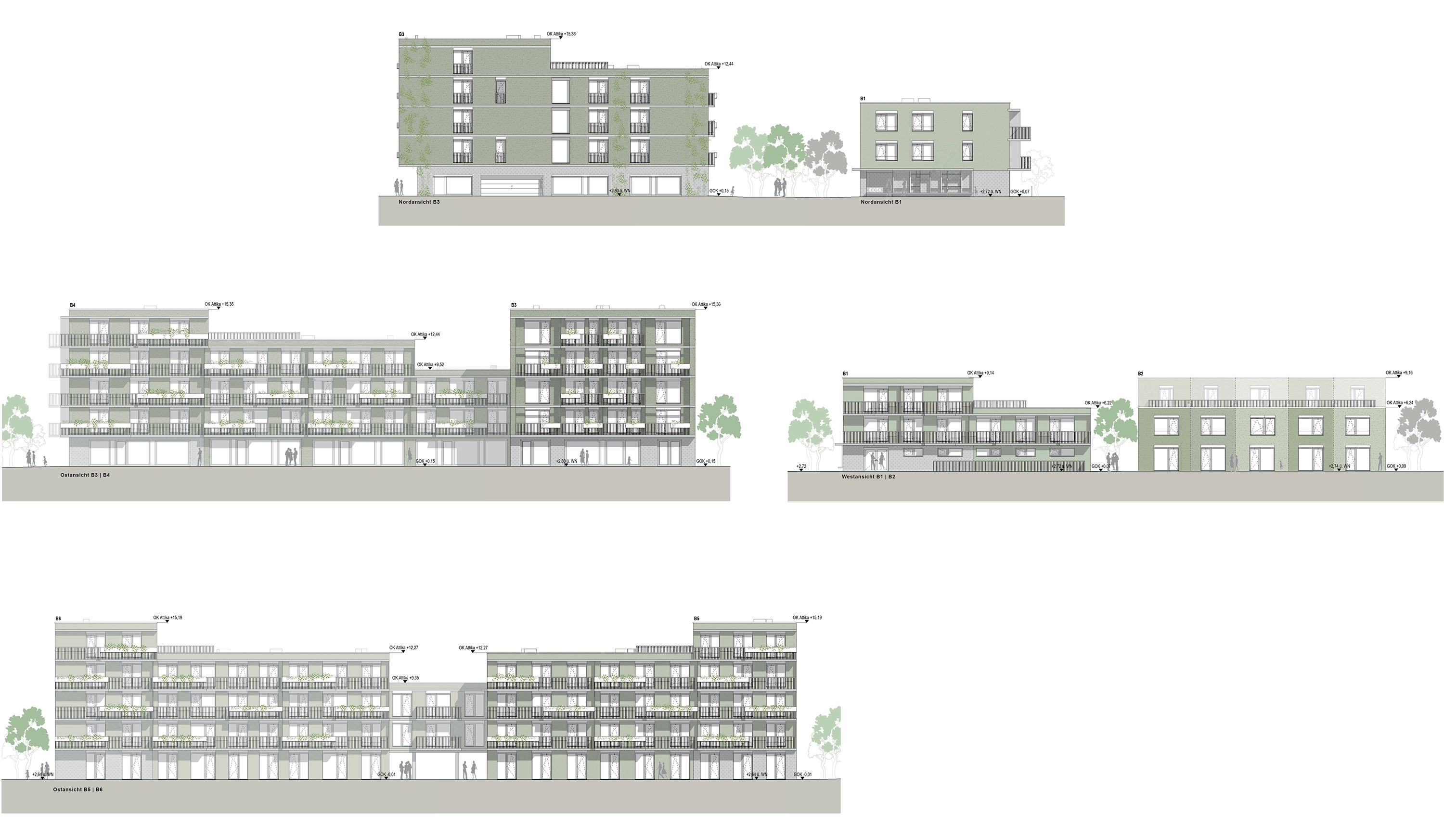 - es besteht aus 5 entlang der angrenzenden Einfamilienhausstruktur im Westen und dem zukünftig angrenzenden Park im Osten angeordnete 2-4 Geschossige und zueinander versetzt stufenartige Baukörper