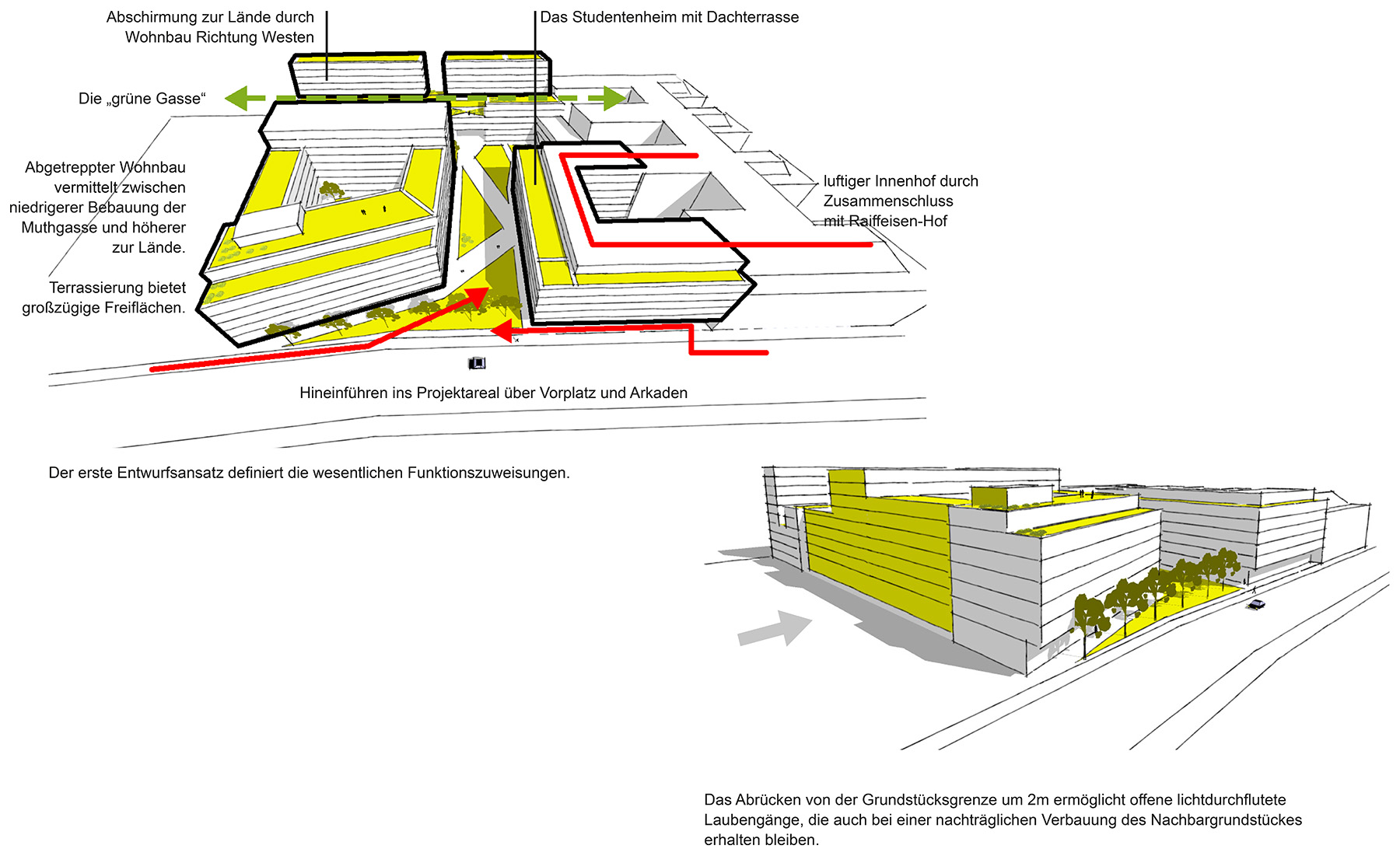 - Flächen mit schattigen begrünten Inseln zum Aufenthalt inkl. Sitzmöglichkeiten für die Hausgemeinschaft im gesamten Areal