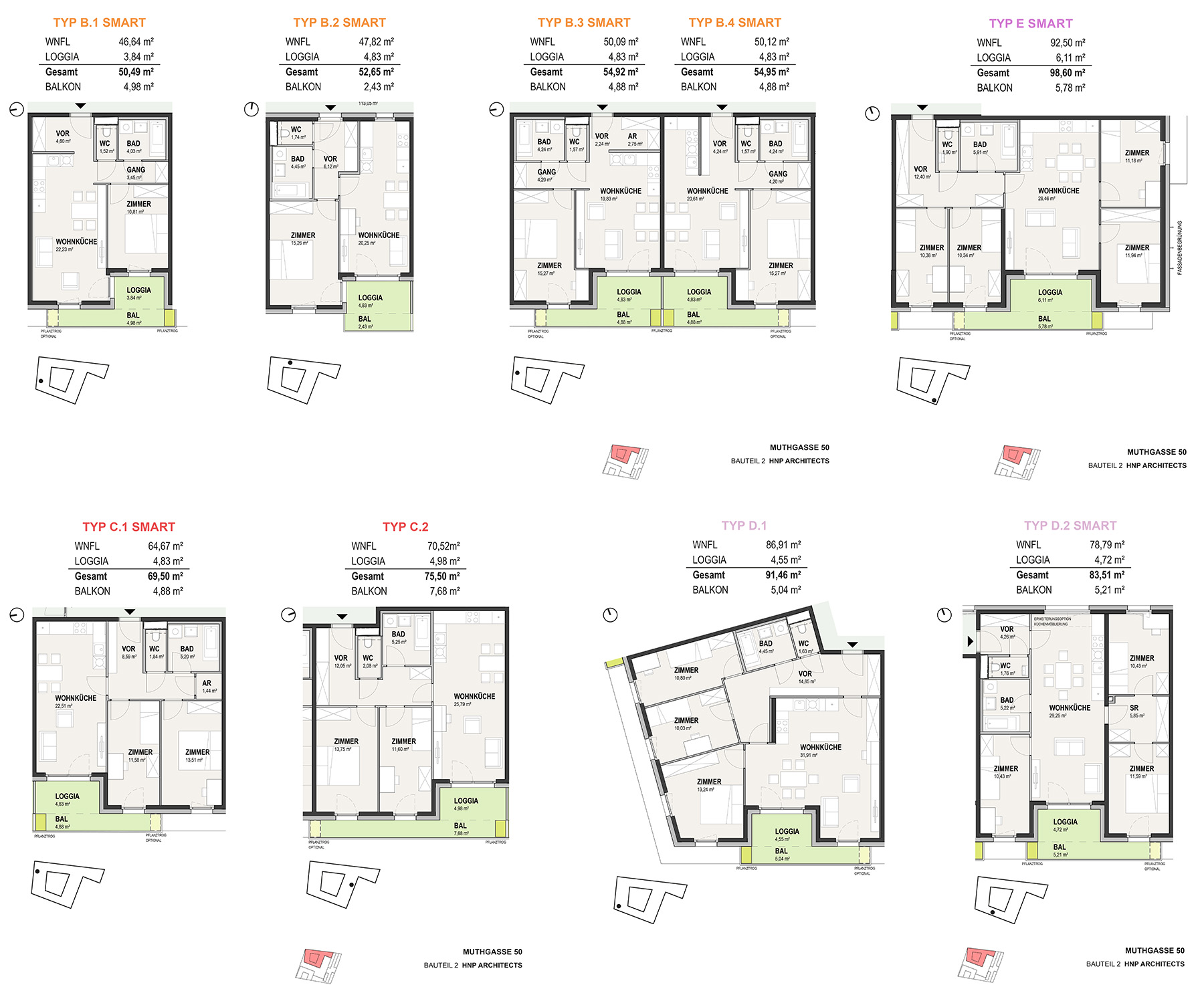 - Der gesamte Bauplatz besteht aus drei Bauteilen. Im Bauteil 1 befindet sich ein Student*innenheim und freifinanzierte Gewerbeflächen (nähere Informationen hierzu sind nur über den Bauträger möglich). Die Bauteile 2 und 3 bestehen größtenteils aus geförderten Wohnungen. Insgesamt werden 238 geförderte Mietwohnungen errichtet, davon werden 119 Wohnungen nach dem SMART-Wohnbauprogramm mit Superförderung umgesetzt.