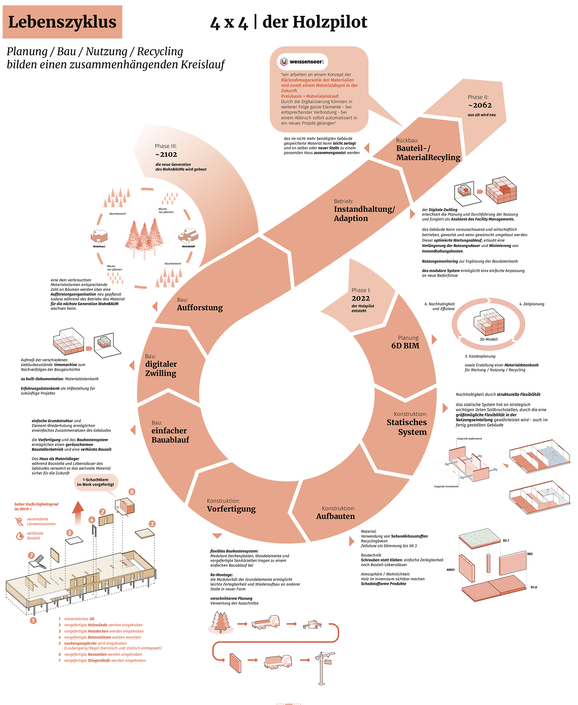 - Das entwickelte Holzbaukastensystem erfordert im Lebenszyklus einen geringeren Materialaufwand, kombiniert materialgerechte Bauweisen mit einem innovativen Energiesystem