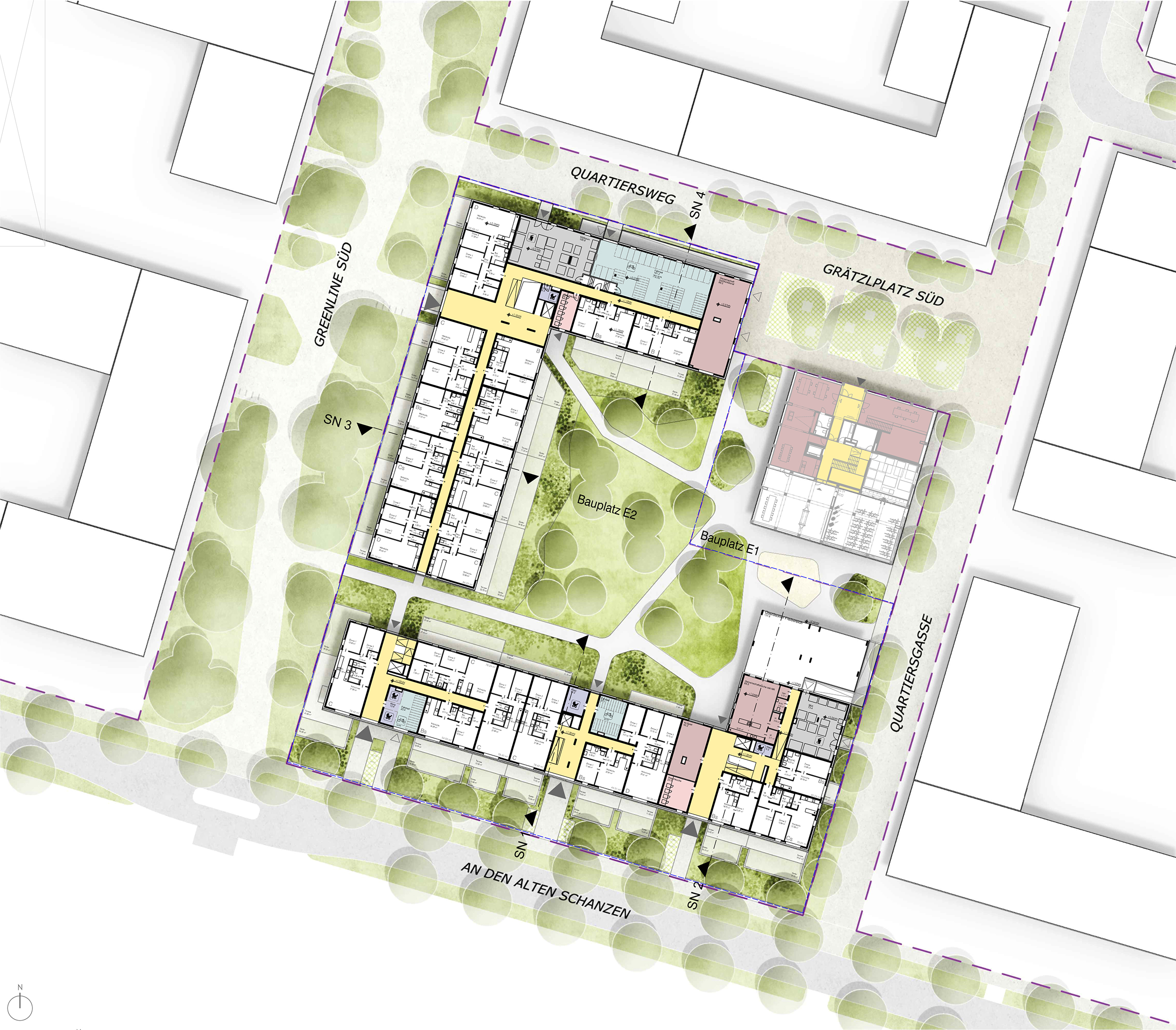 - das Projekt stellt den „An den alten Schanzen“ gelegenen Teil eines bauplatzübergreifenden Gemeinschaftsprojekts dar. Dieses besteht aus zwei unterschiedlich hohen L-förmigen Baukörpern mit gemeinschaftlich genutzten Dachgärten