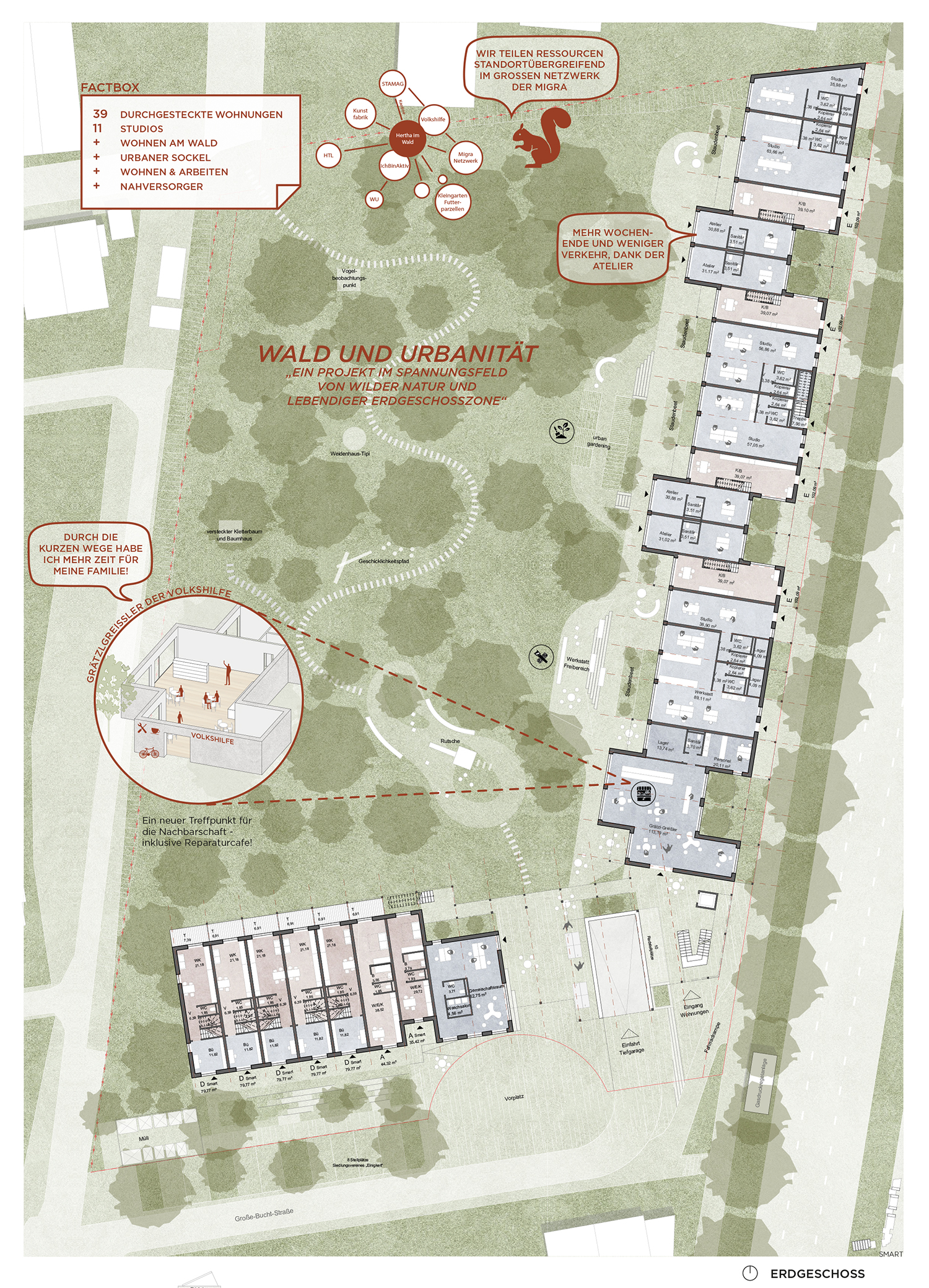 - Vertikalbegrünung im Sockelbereich straßenseitig und zum „Stadtwald“