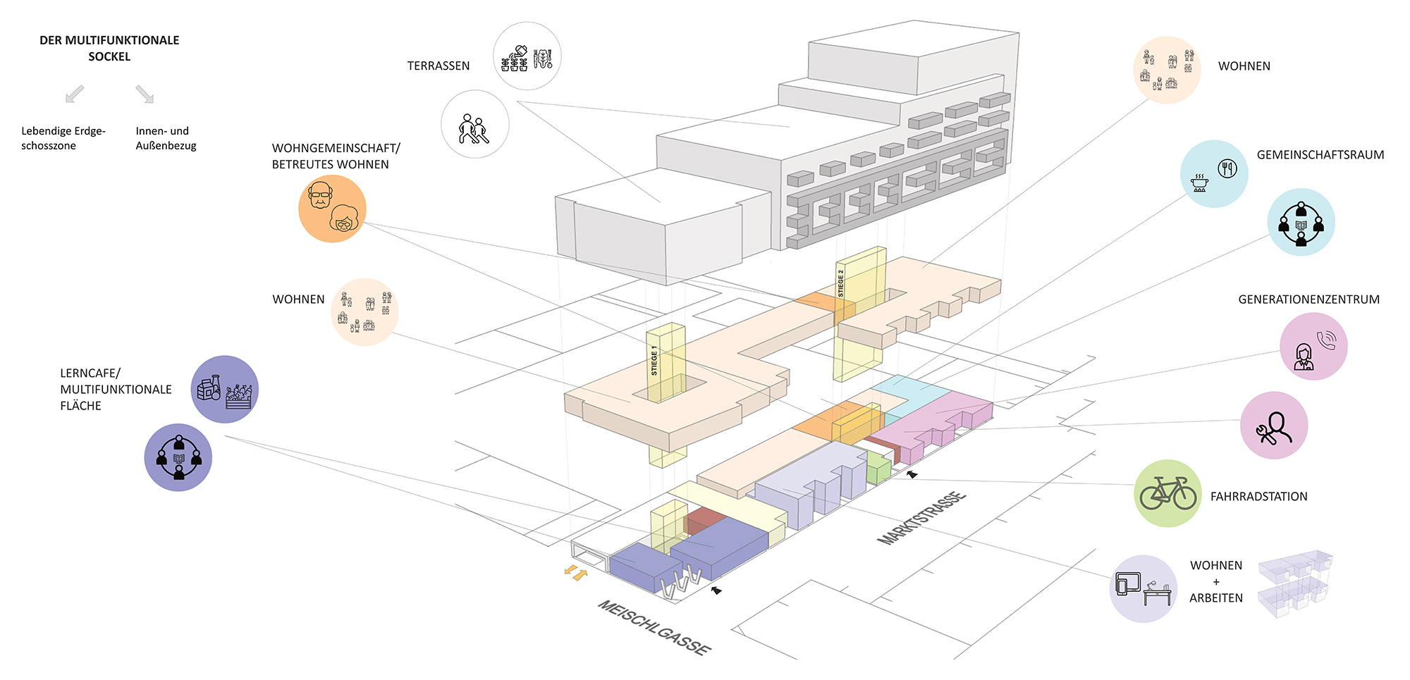 - Hausbetreuungsstützpunkt der Volkshilfe Wien als Generationenzentrum für die Gemeinschaft: integrierte Senior*innen-Wohngemeinschaft und -Begleitung, Lernhilfe, Repaircafé, Leihoma/-opa aus der Nachbarschaft, Tauschladen im Sinne der Kreislaufwirtschaft