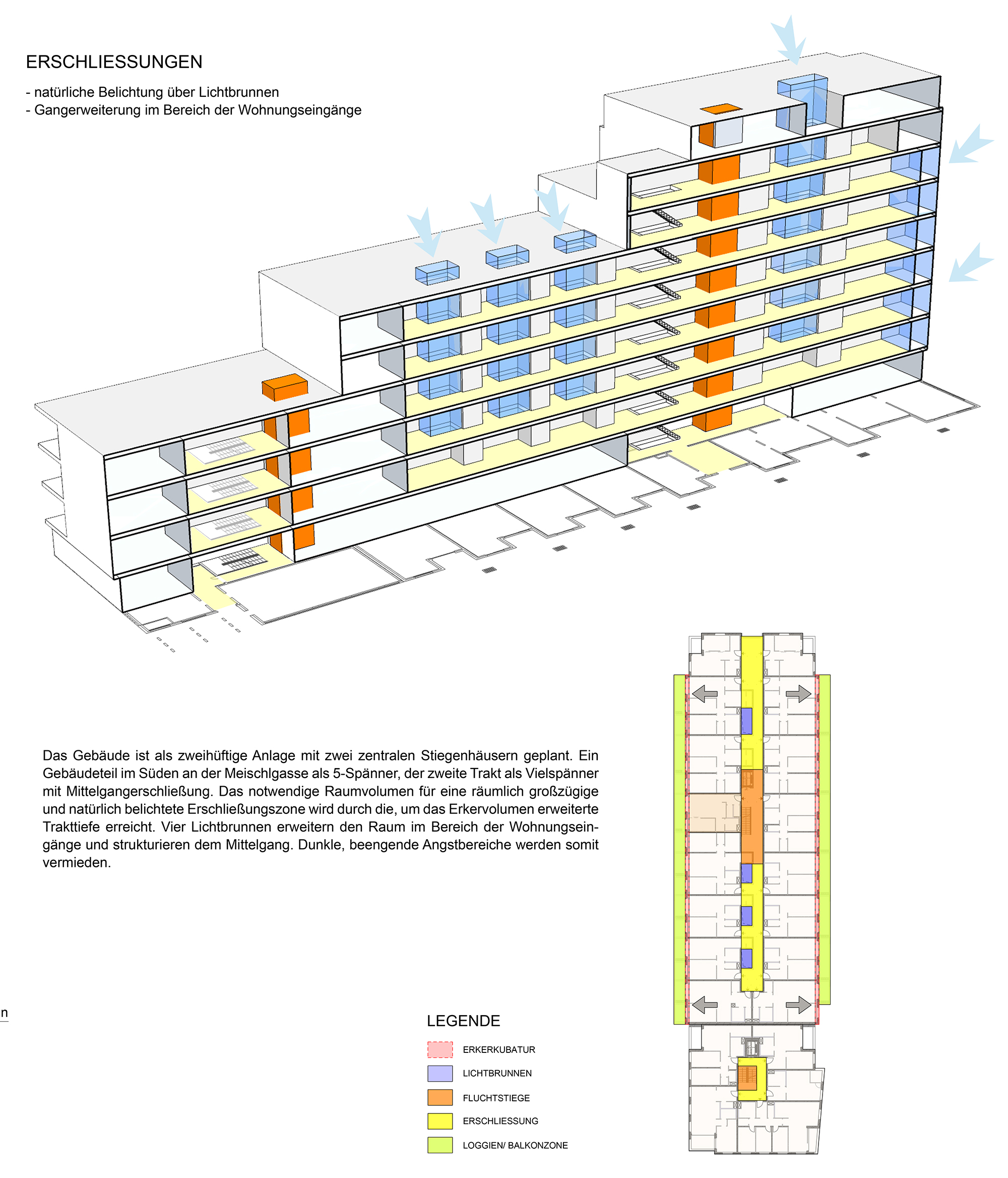 - Atelierwohnungen im Sockelbereich mit besonderer Aufteilung als Modell für „Arbeiten und Wohnen“