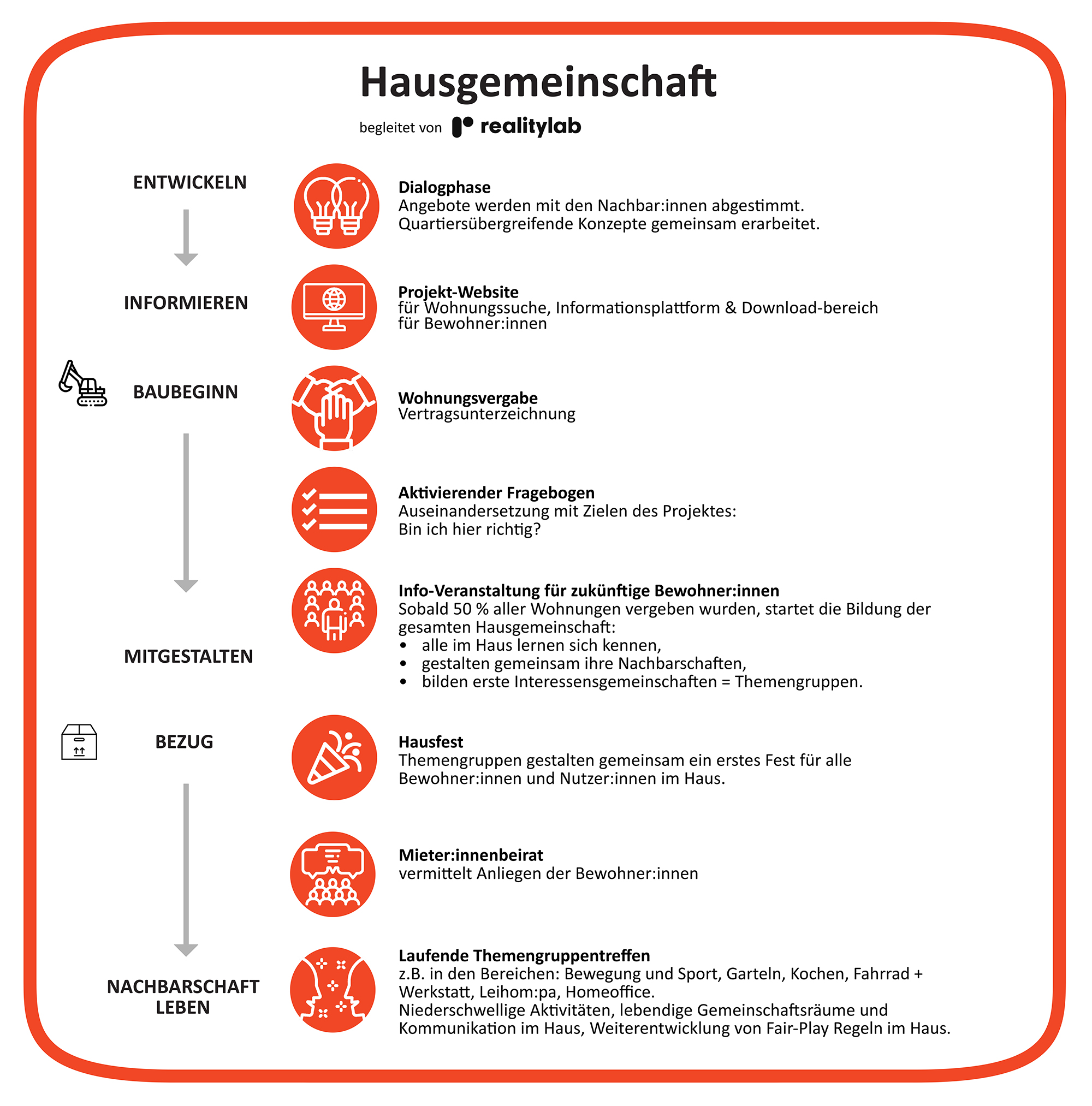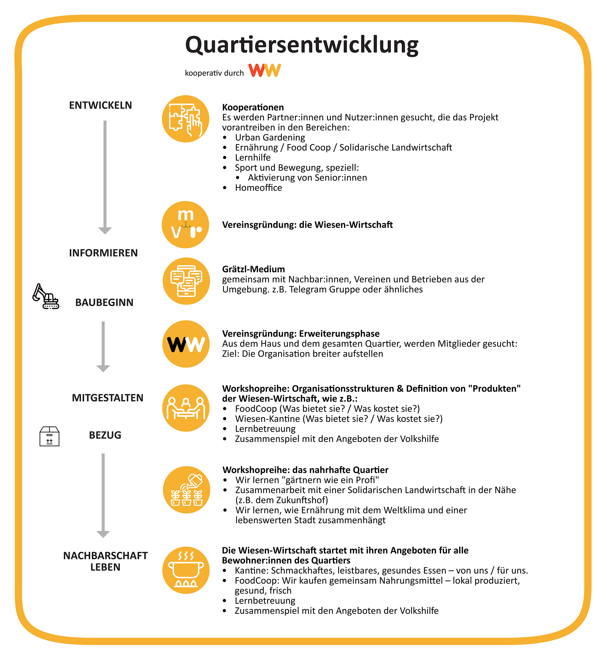- Besiedlungsbegleitung durch realitylab und den Verein „Wiesen Wirtschaft“: gemeinsames Kochen und Gärtnern, Ernährungskantine im EG, Food Coop/Solidarische Landwirtschaft, Sport und Bewegung, Möglichkeit für Homeoffice