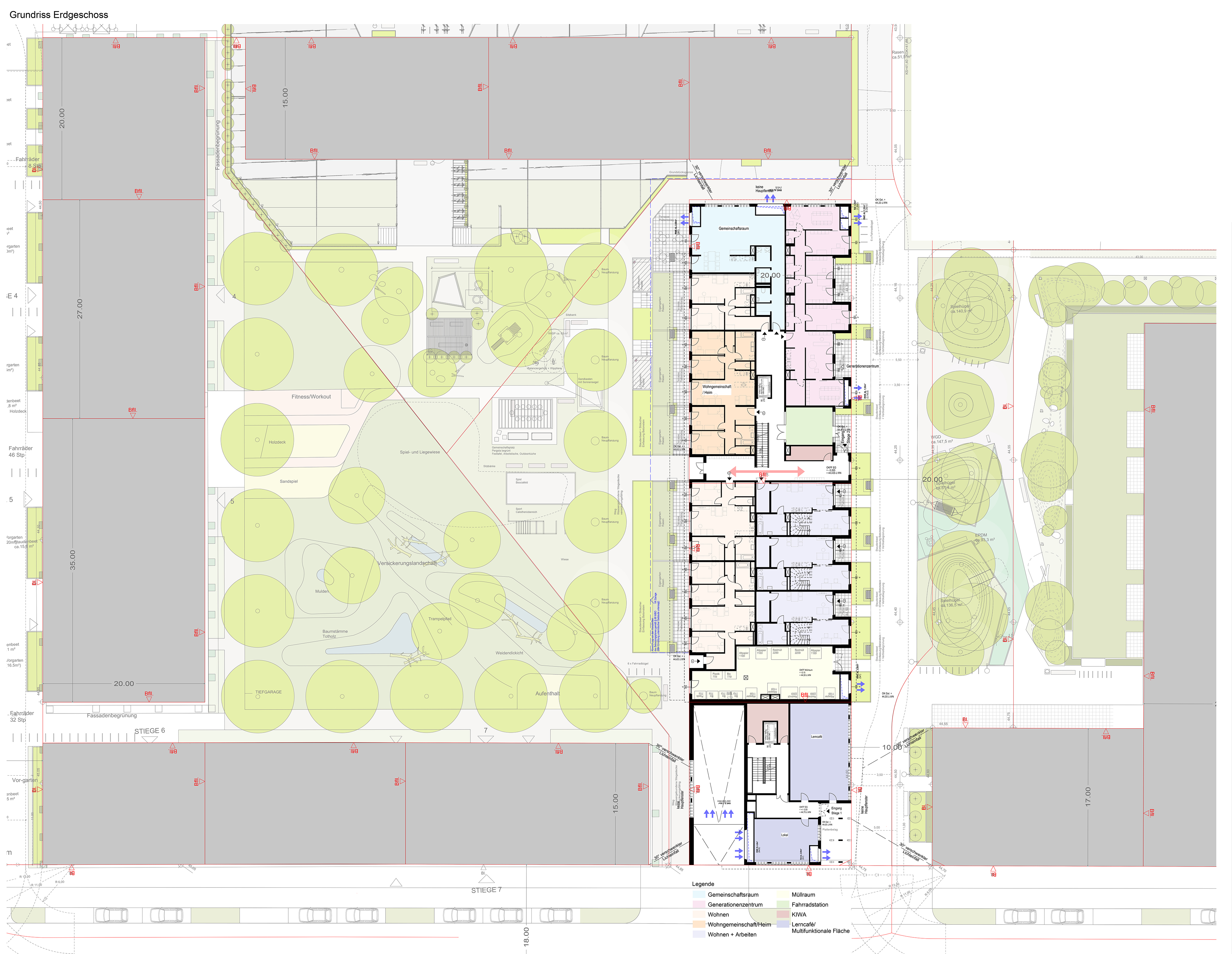 - großer multifunktionaler Gemeinschaftsraum mit Gemeinschaftsküche als Generationen-Treffpunkt im Erdgeschoß mit vorgelagerter Terrasse im nördlichen Teil des Grundstücks