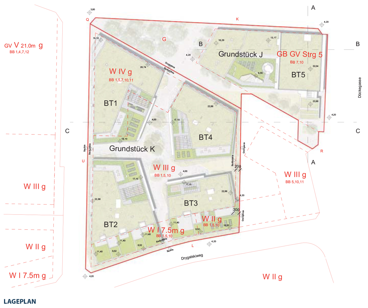 - auf den Bauplätzen J + K entsteht das Neubauprojekt „Donaufelder Freundschaften“ mit fünf Baukörpern und umfasst insgesamt 247 geförderte Mietwohnungen.