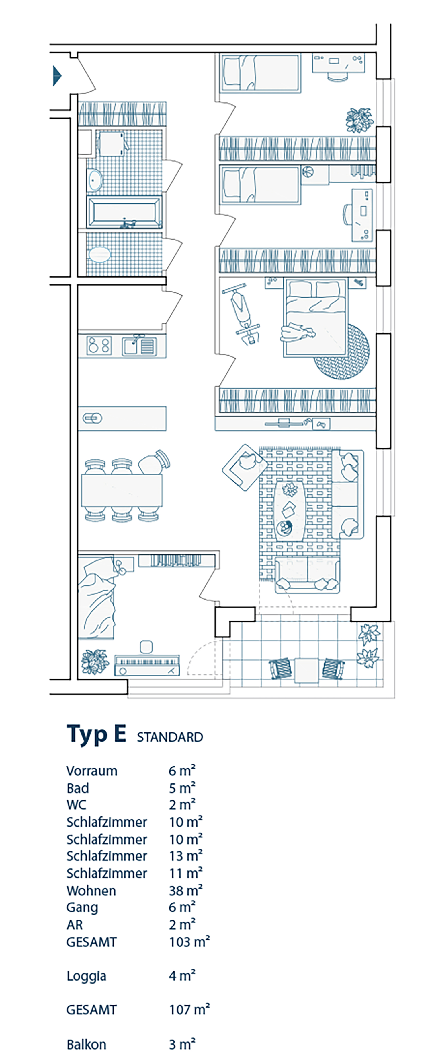 - alle Wohnungen verfügen über eine private Freifläche als Erweiterung des Wohnraumes