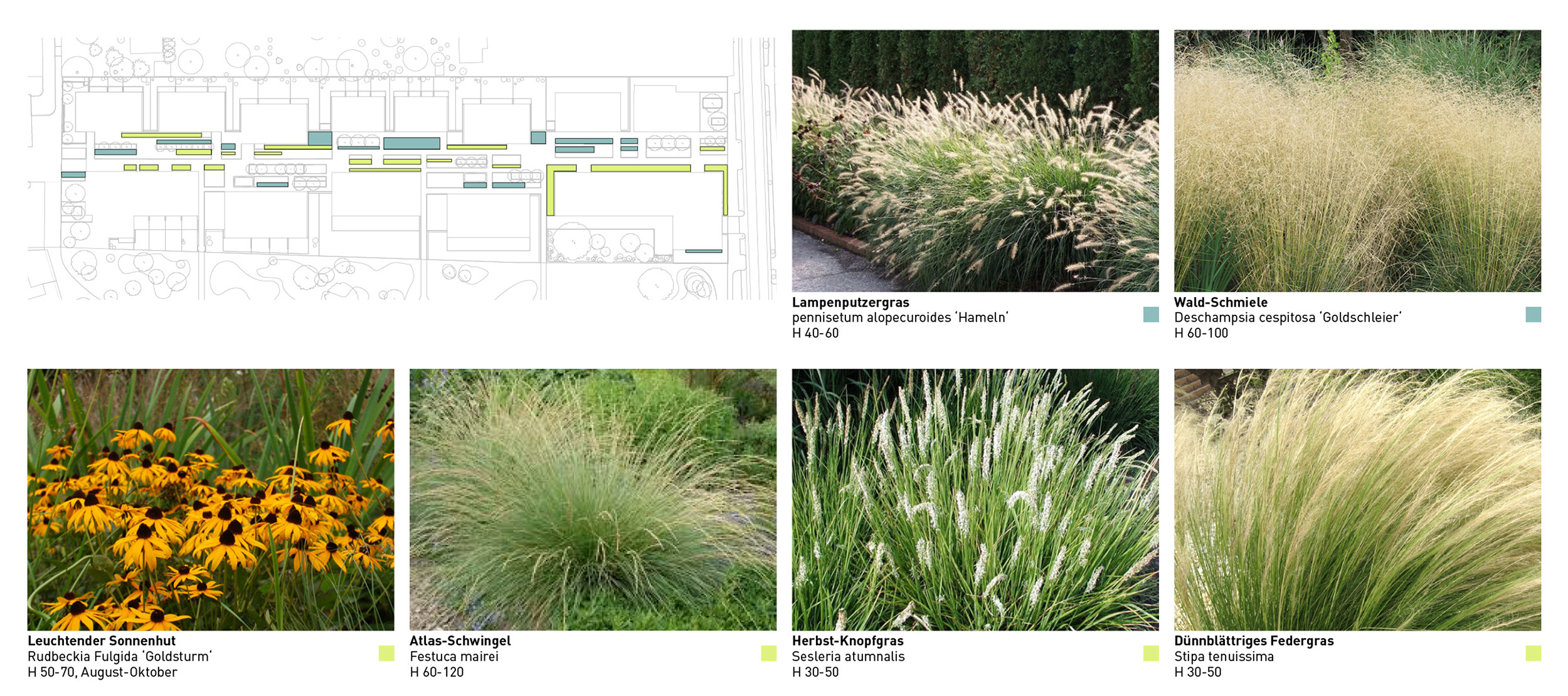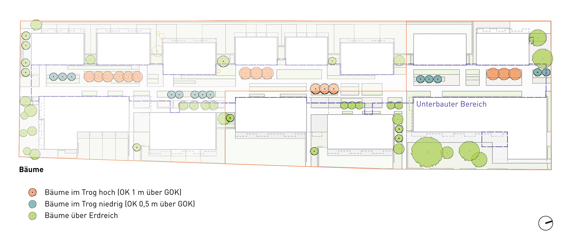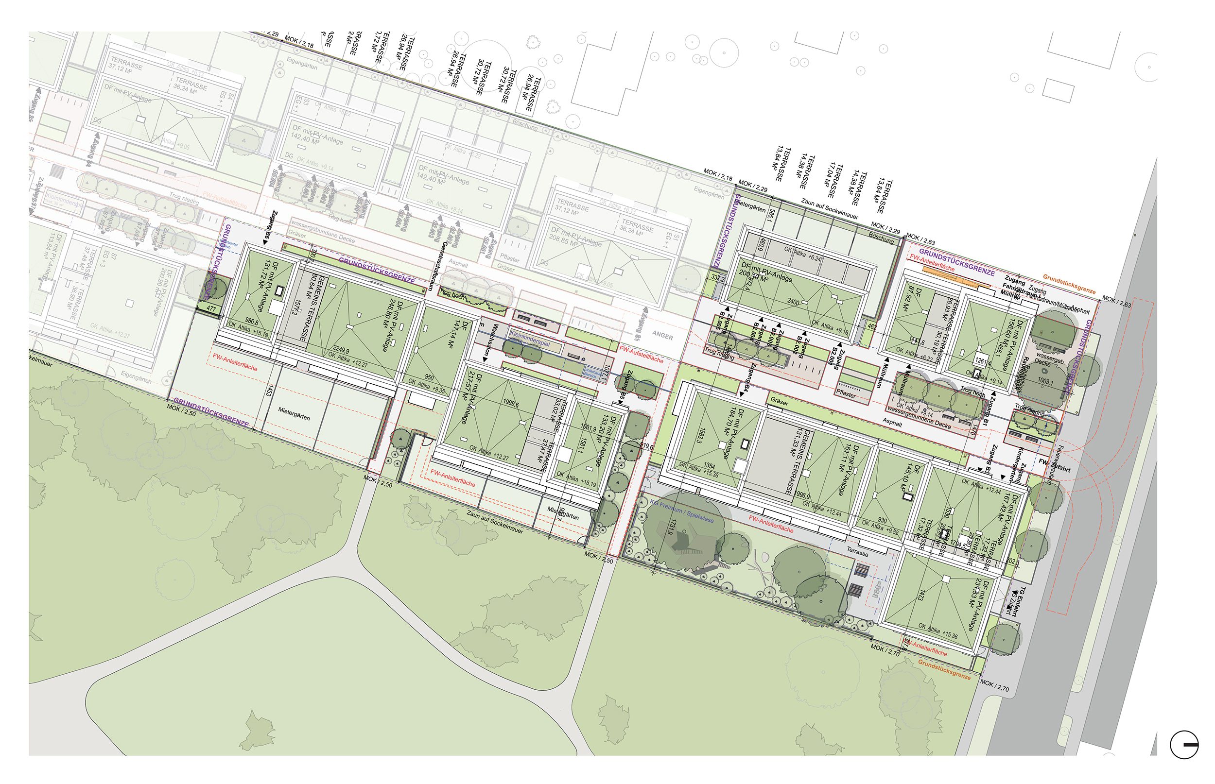 - der mittig verlaufende grüne Anger mit öffentlichen Begegnungszonen und Kinderspielplätzen sowie seinen schattenspendenden Bäumen stellt das Herzstück der Anlage dar