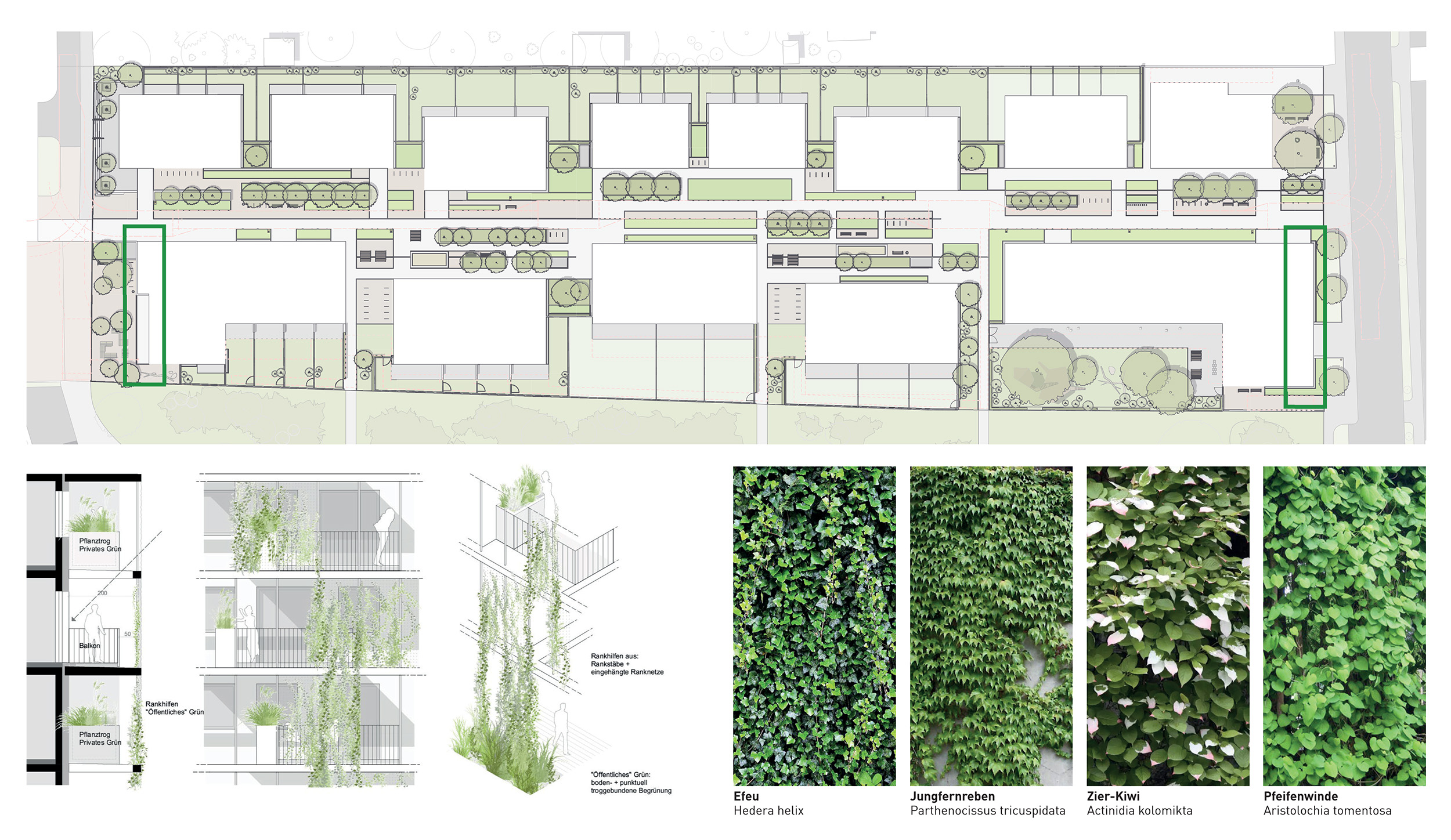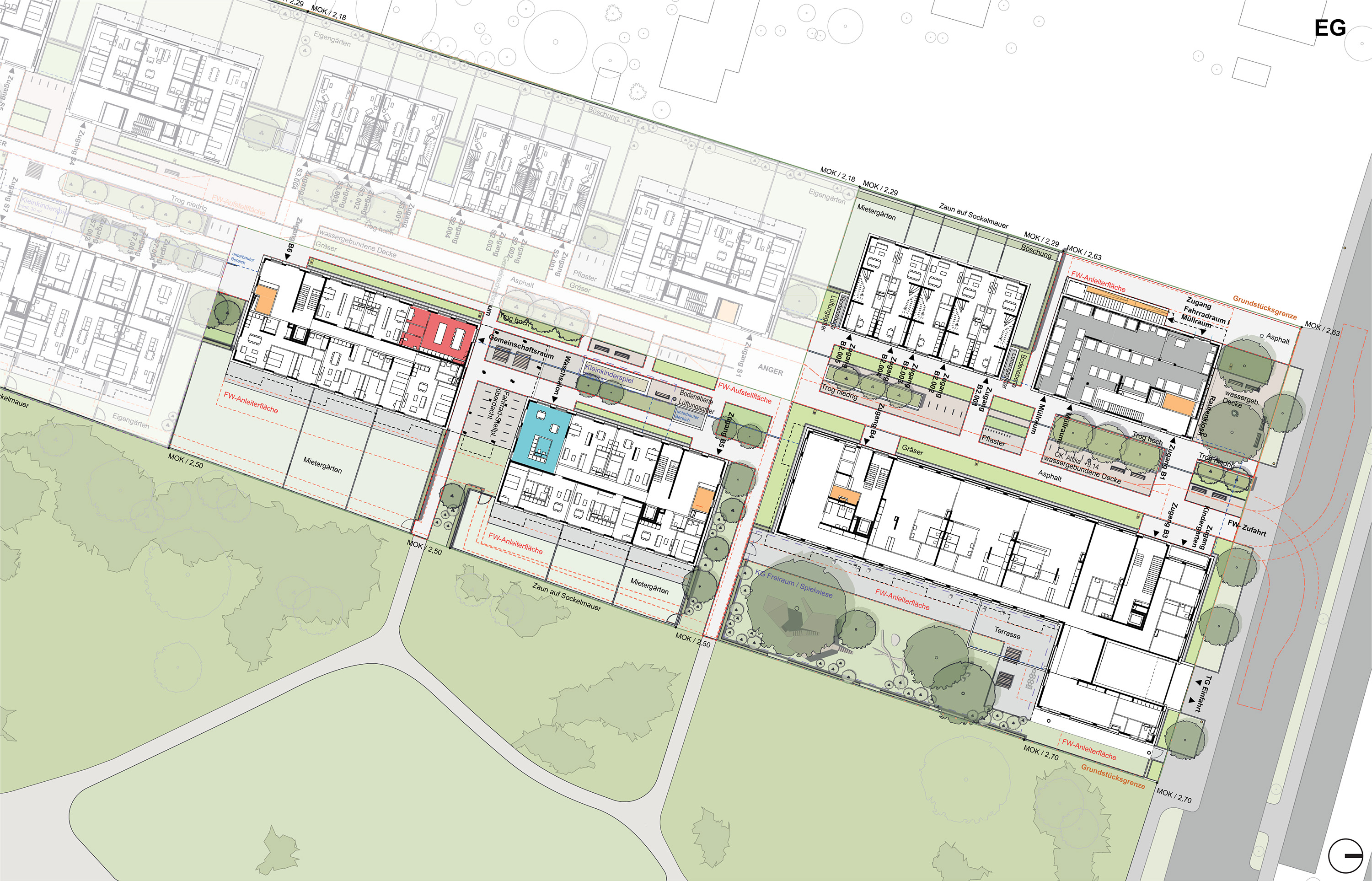- es besteht aus 5 entlang der angrenzenden Einfamilienhausstruktur im Westen und dem zukünftig angrenzenden Park im Osten angeordnete 2-4 Geschossige und zueinander versetzt stufenartige Baukörper