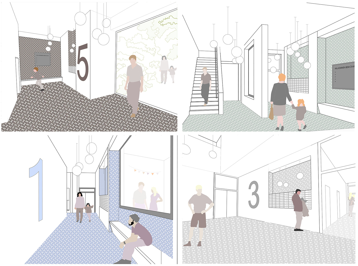 - zweigeschoßiger Gemeinschaftsraum mit Sichtfenster zur Waschküche im Erdgeschoß; insgesamt drei Gemeinschaftsräume auf die Gebäude verteilt