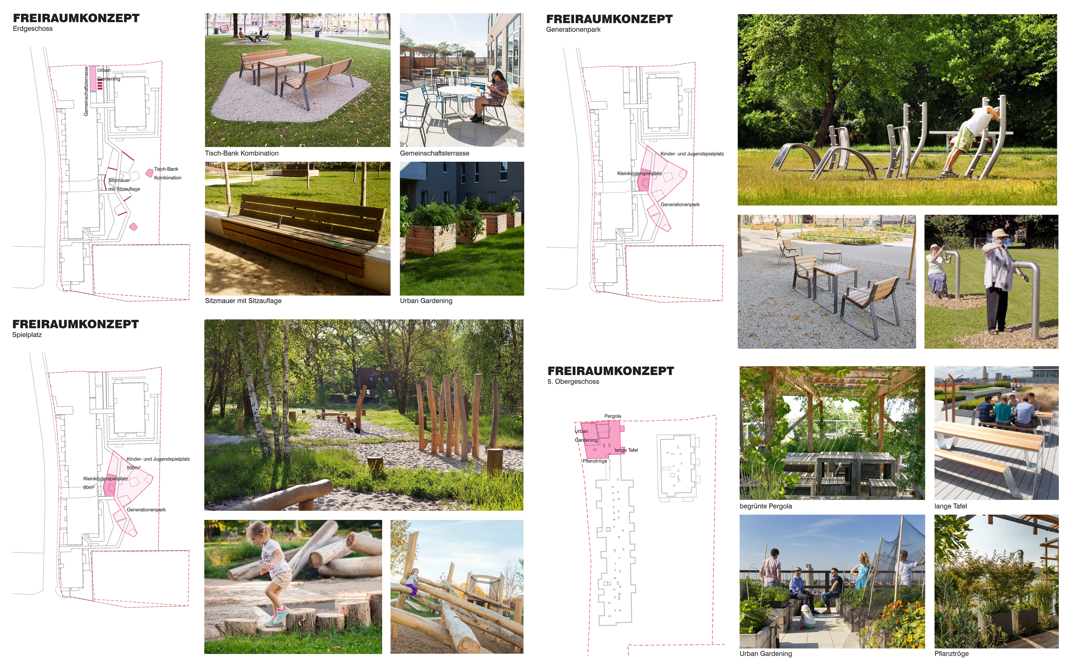 - Sitzmauern mit Sitzauflagen sowie Tisch-Bank Kombinationen entlang der Spielplätze mit schattenspendenden Baumbeständen