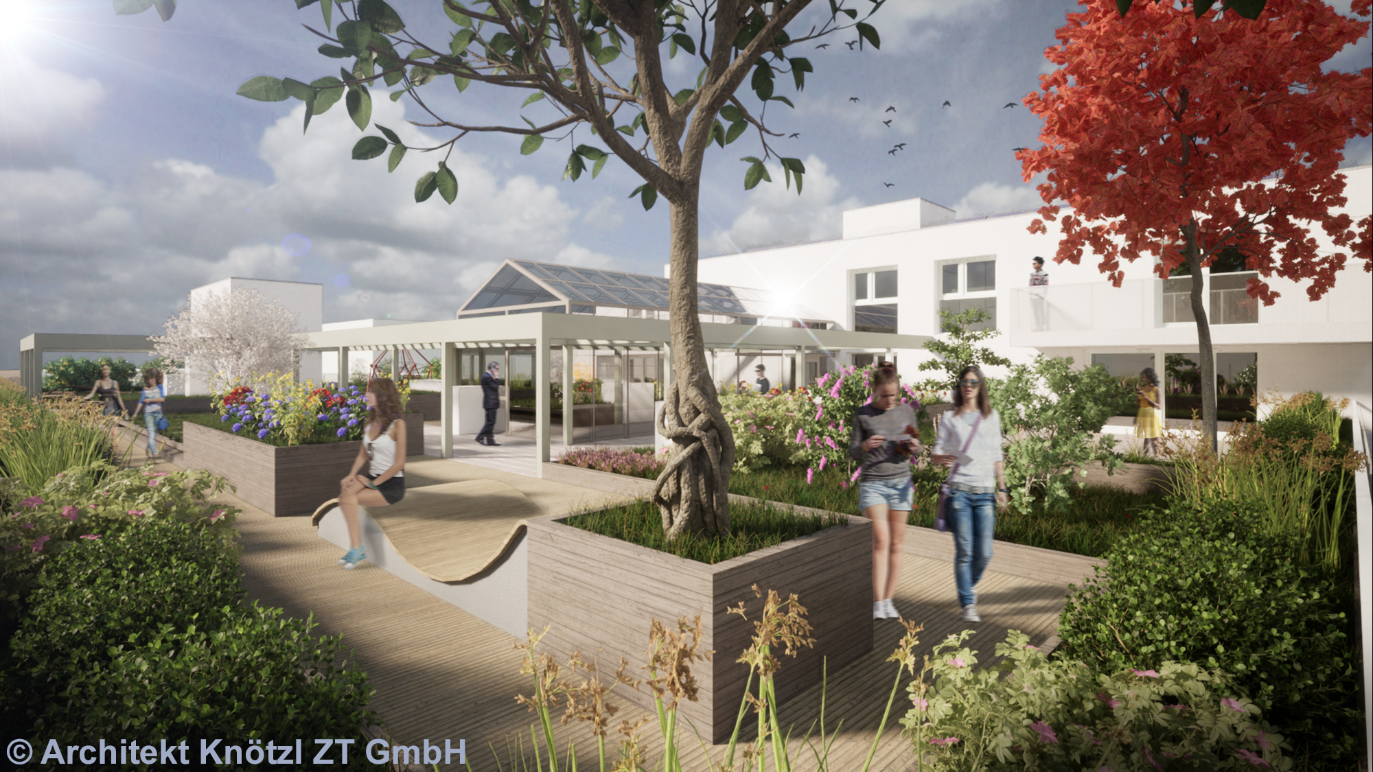 - eine begehbare Dachterrasse mit Glashaus und Hochbeeten für Urban Gardening ist vorgesehen