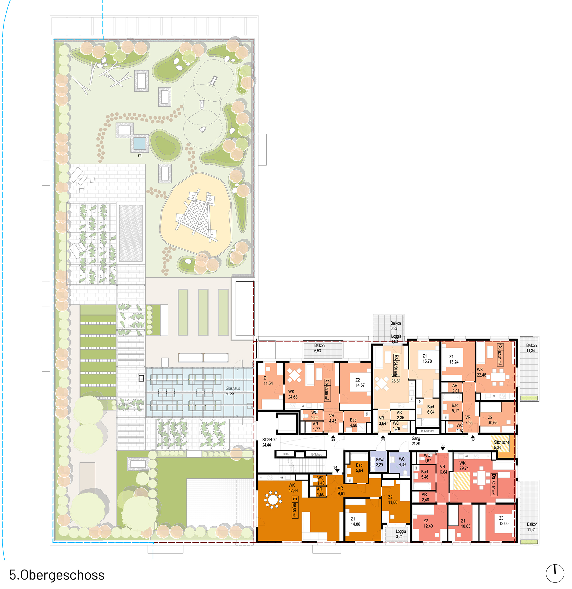 - Gemeinschaftsterrasse mit Glashaus im 5. Obergeschoß für Urban Gardening mit Pergola, Sitzplätzen sowie einem Spielplatz mit Wipptieren und Liegenetz als Treffpunkt und kommunikativer Ort der Begegnung