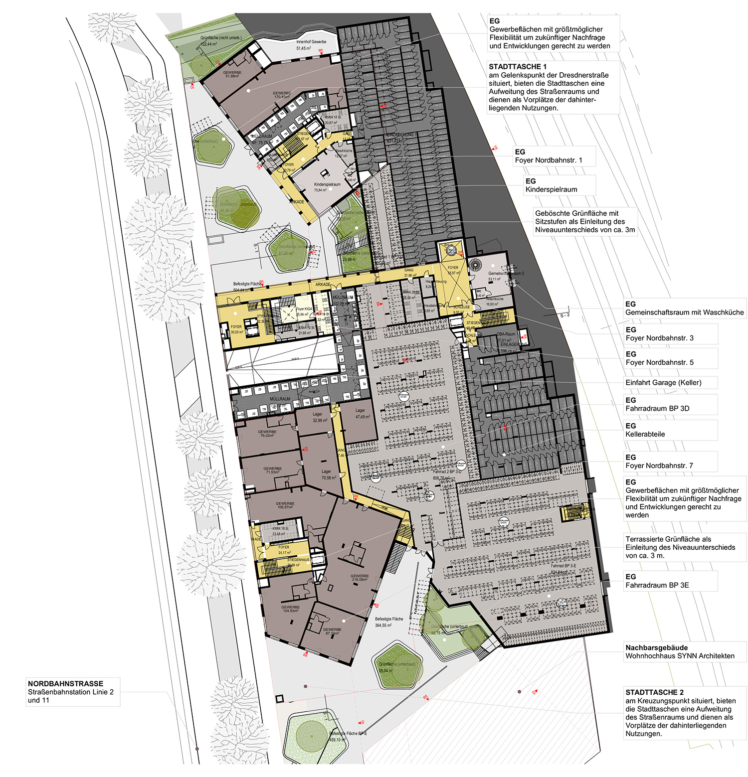 - bauplatzübergreifende Gestaltung mit Quartiersplatz an der Nordbahnstraße als Ort der Begegnung und des Austauschs im Viertel