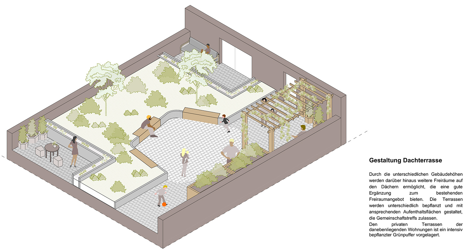 - zwei Dachterrassen im 4. Obergeschoß mit Anbaubeeten und Sitzmöglichkeiten