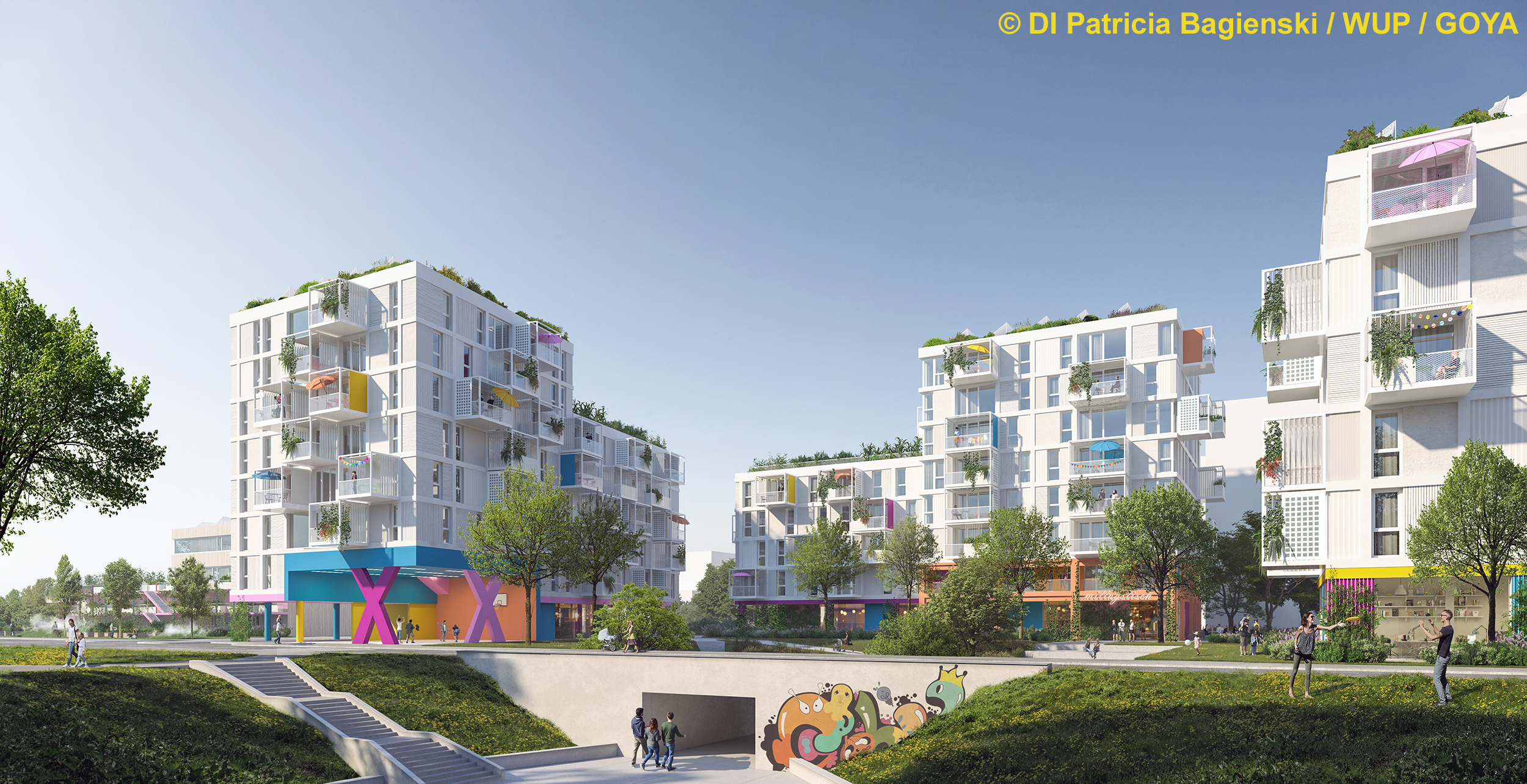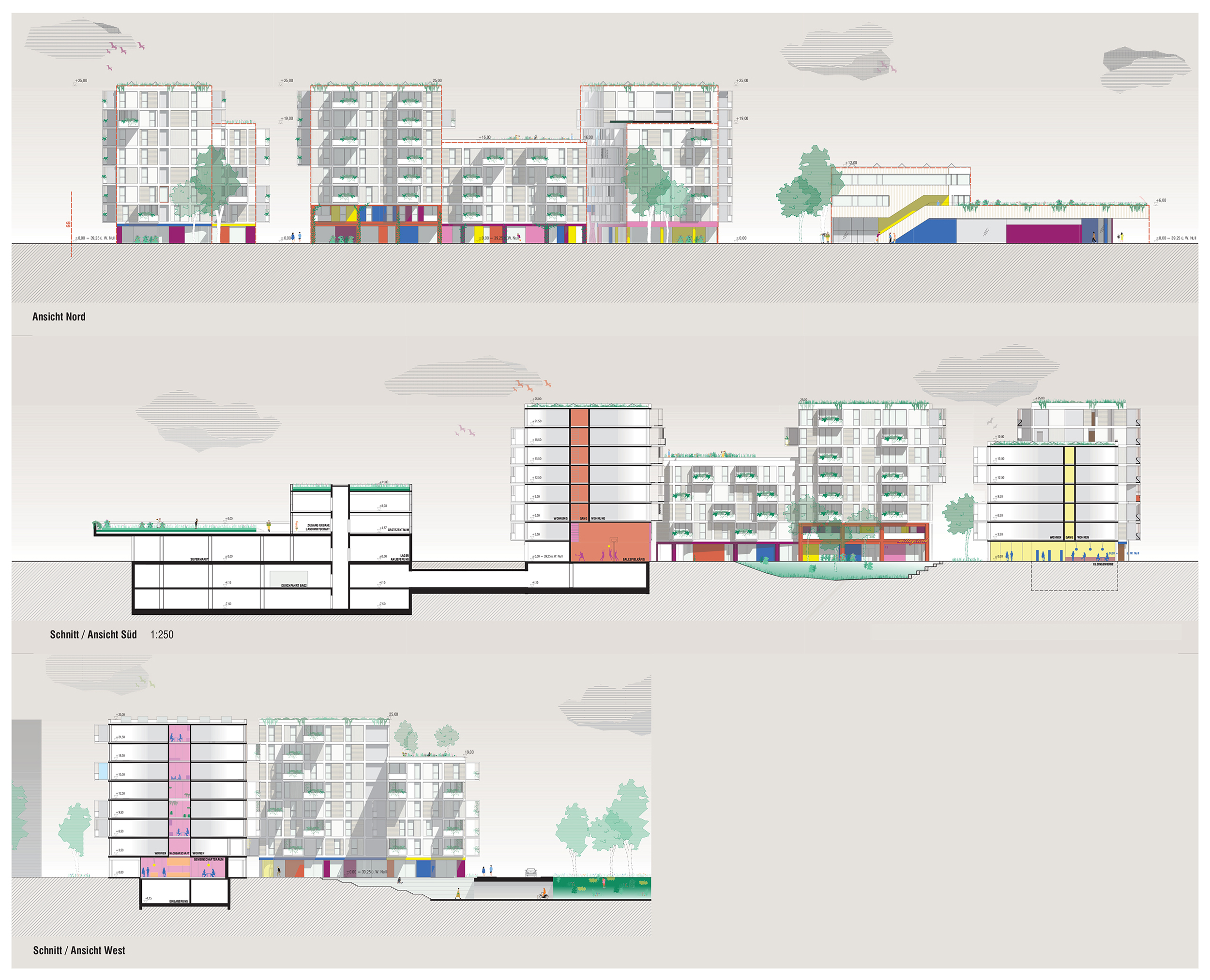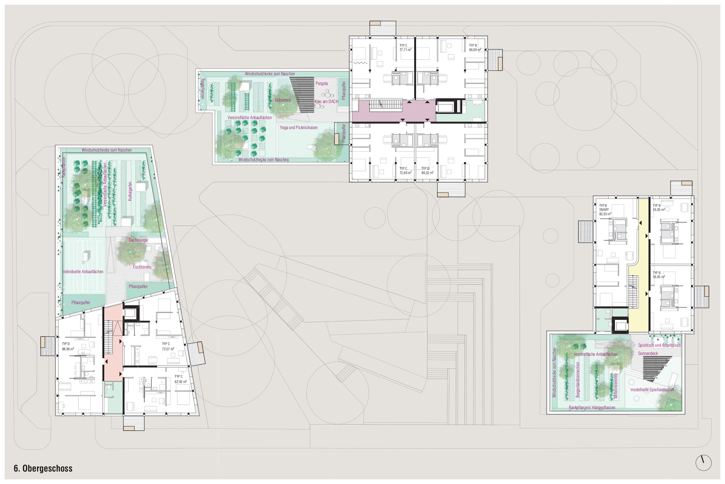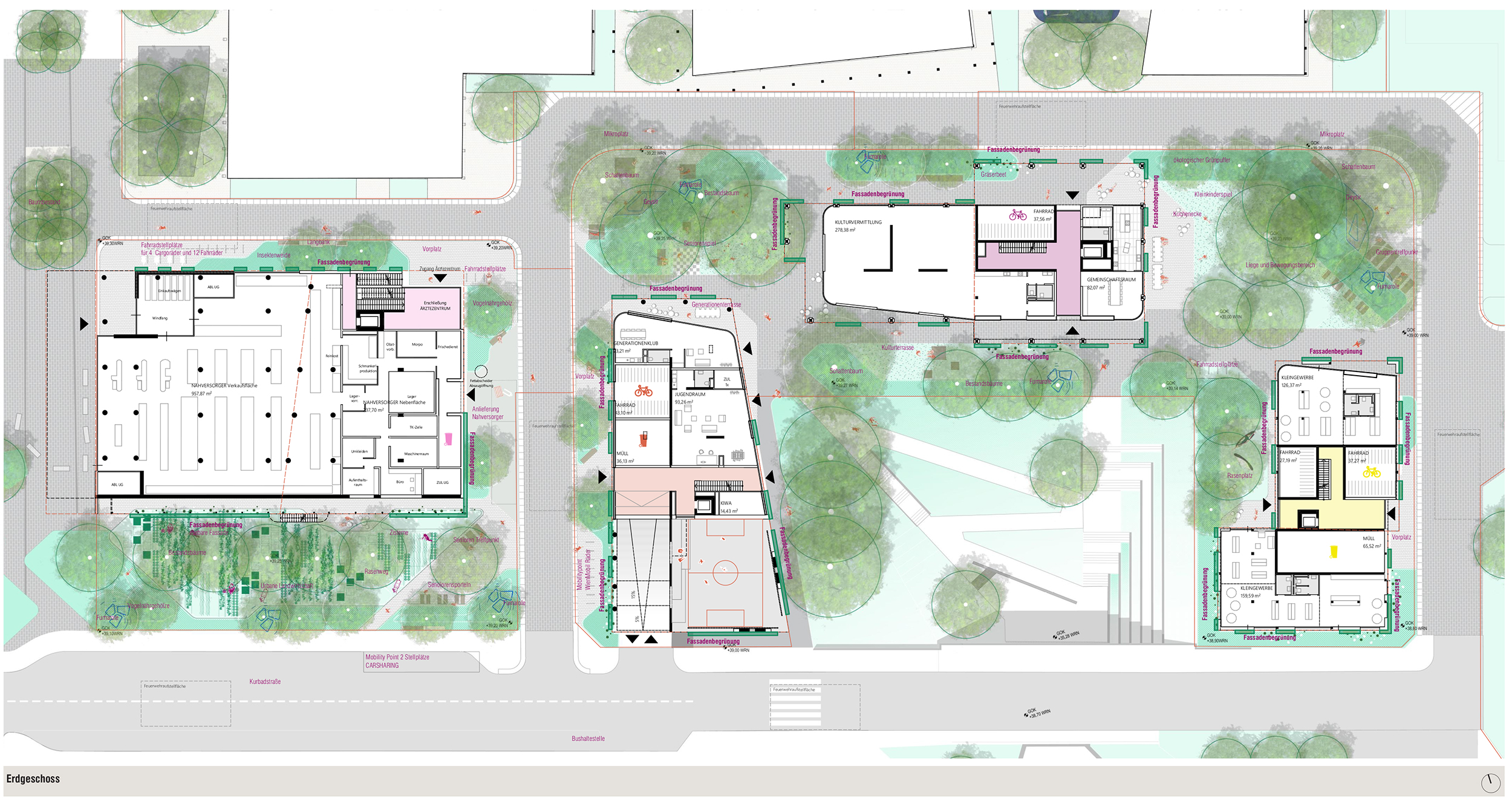 - gemeinschaftlich organisierte Agrarflächen am Dach (hauptsächlich über dem Nahversorger im 1. OG und jeweils auch im 6. OG bei den anderen Gebäuden)