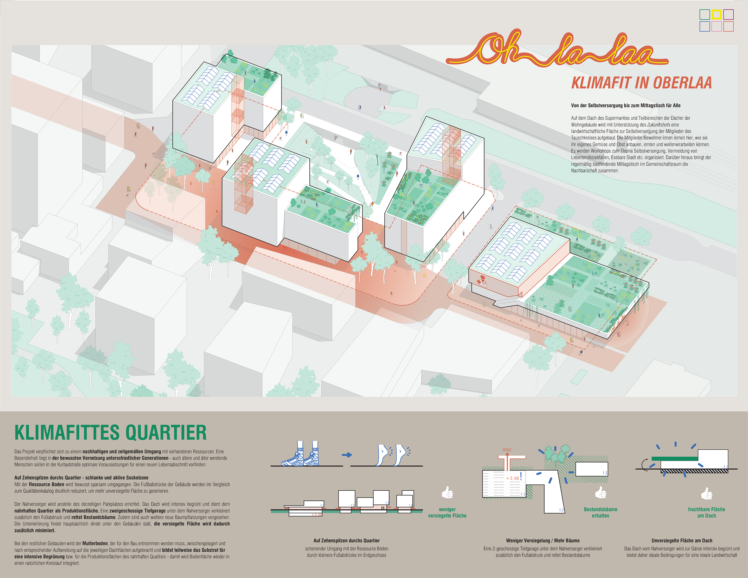 - intensiv begrünte Dachflächen dienen dem nahrhaften Quartier als Produktionsfläche für die landwirtschaftliche Selbstversorgung