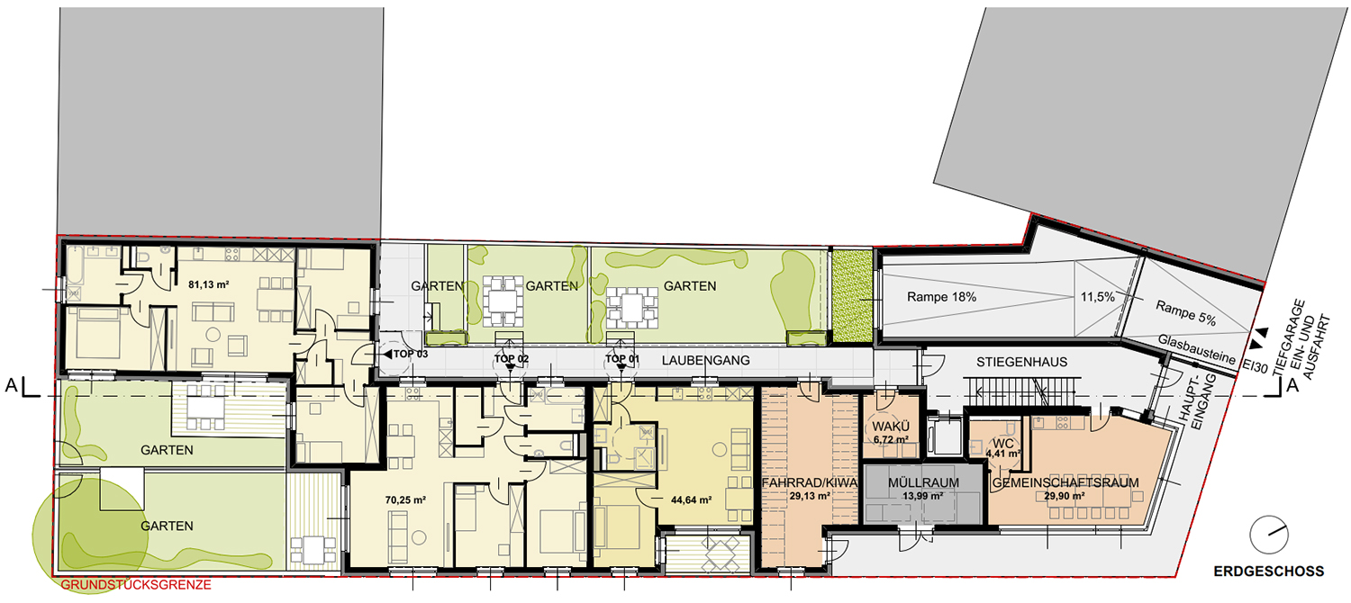 - der Gemeinschaftsraum mit Teeküche und barrierefreiem WC ist beim Haupteingang situiert und kann für Feste und gemeinschaftliche Aktivitäten genützt werden