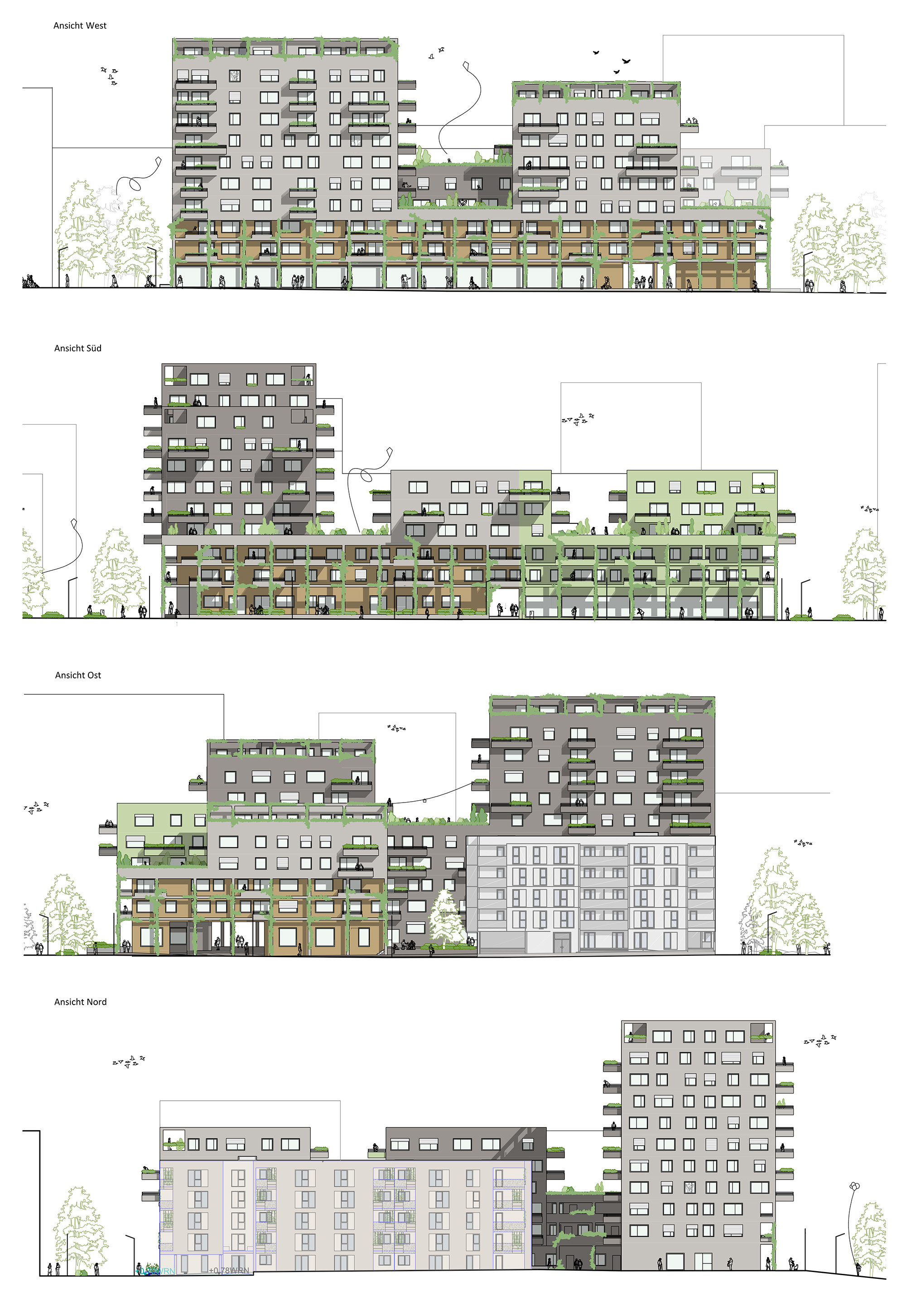 - das Projekt stellt den im Quartier „Oberes Hausfeld“ gelegenen mittleren Teil eines bauplatzübergreifenden Gemeinschaftsprojekts dar. Dieses besteht aus einer 3-geschossigen Sockelzone mit umlaufenden Arkadengang und darauf aufgesetzt, freistehende und zueinander versetzte Punktbaukörper in unterschiedlicher Höhe - „die Punkte am Hausfeld“
